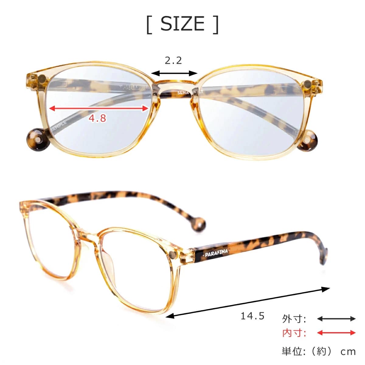 | サイズ | レンズ幅:約 4.8(cm) ブリッジ:約 2.2(cm) テンプル:約 14.5(cm) |