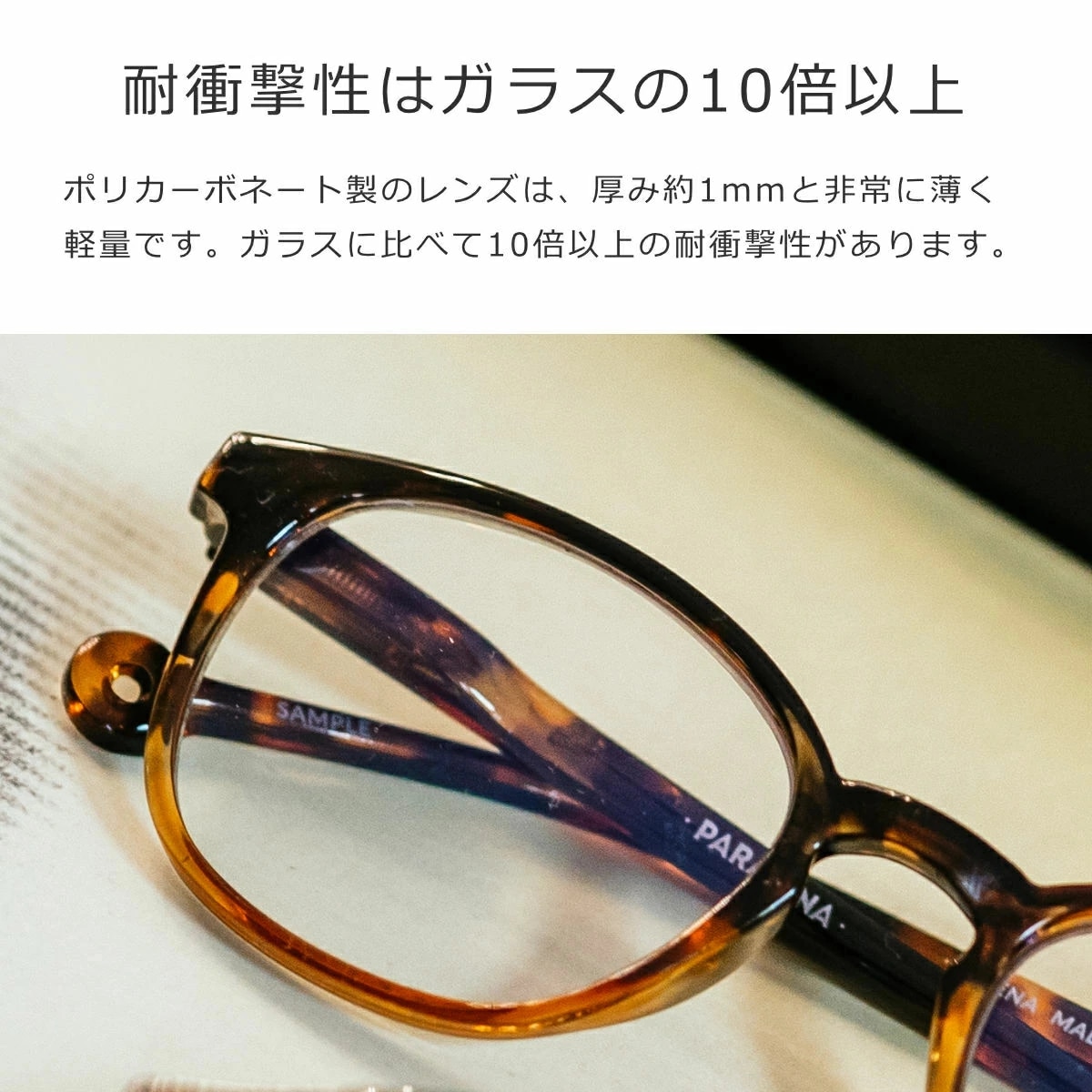 ポリカーボネート製のレンズは、厚み約1mmと非常に薄く軽量です。ガラスに比べて10倍以上の耐衝撃性があるので、安心してお使いいただけます。