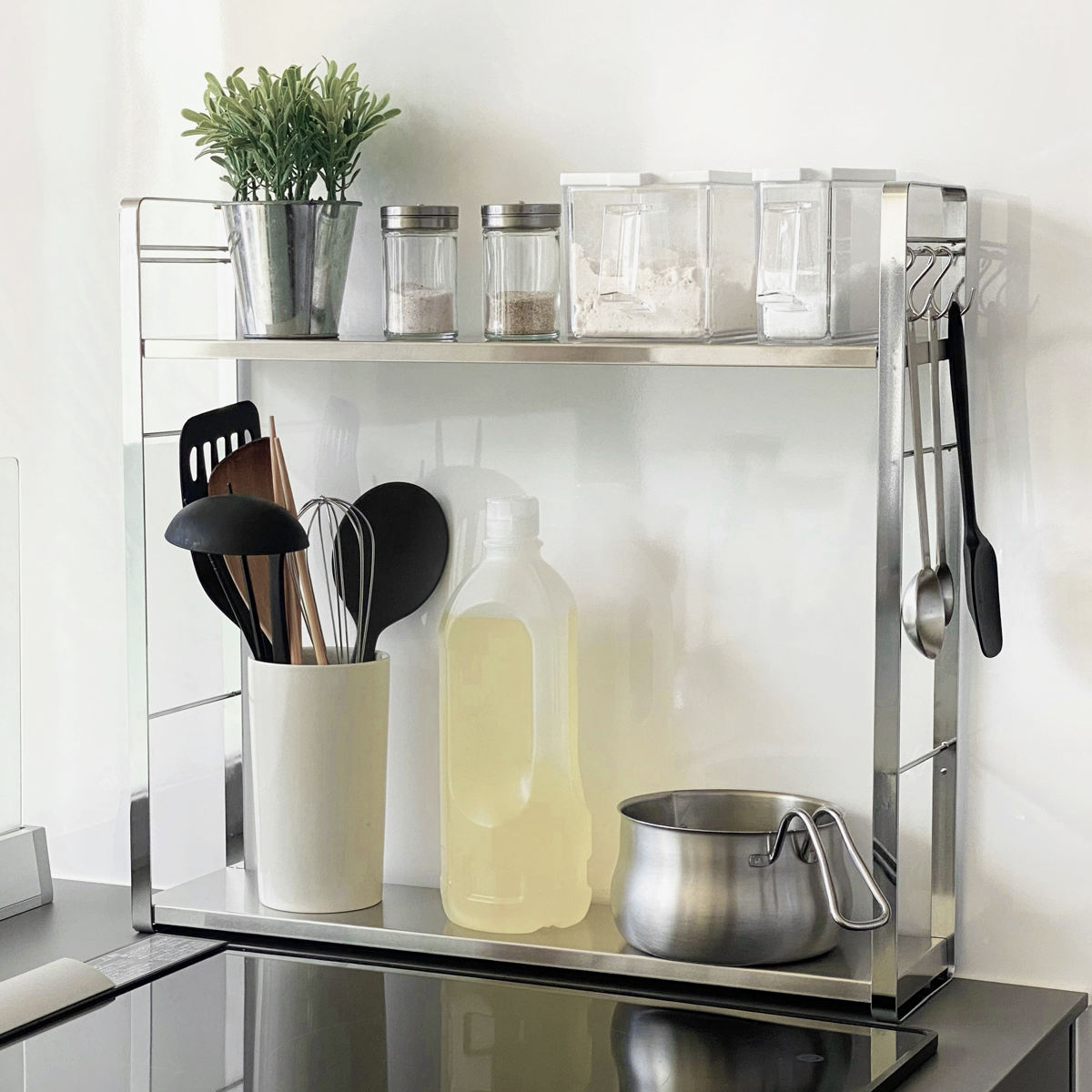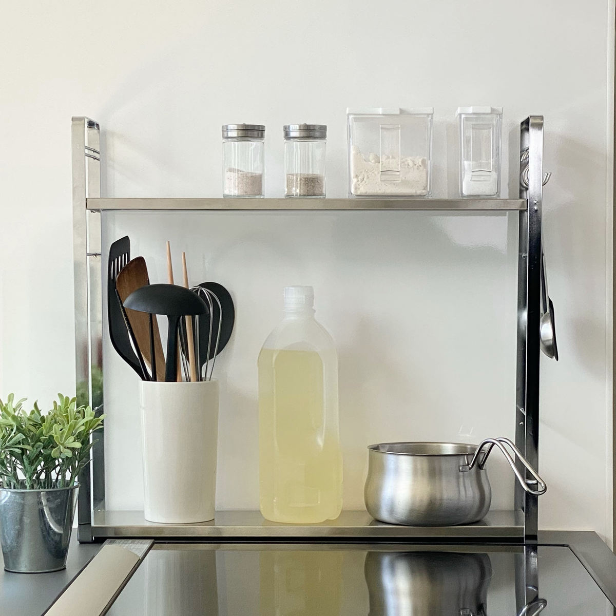 下段にもステンレスの棚板を採用。小さめのケトルやミルクパン、オイルポットなども置くことができ、調味料を置いても安定感があります。
