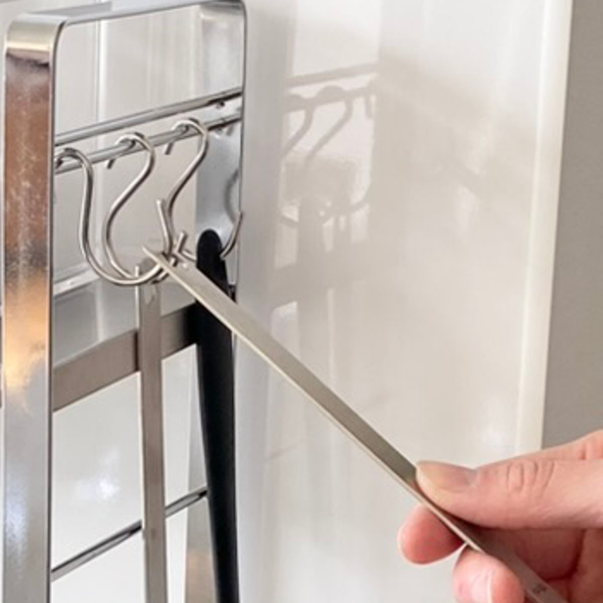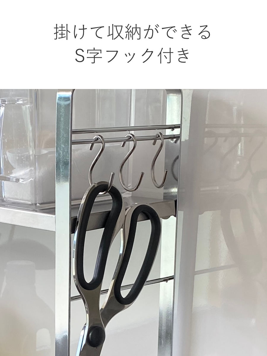 よく使うキッチンツールを掛けて収納する時に便利なS字フックが3個付属しています。物の長さに合わせてS字フックを掛ける場所を変えることも可能です。ダブルワイヤーにすることでS字フックの遊びを抑え、ツールの掛けにくさを解消しました。