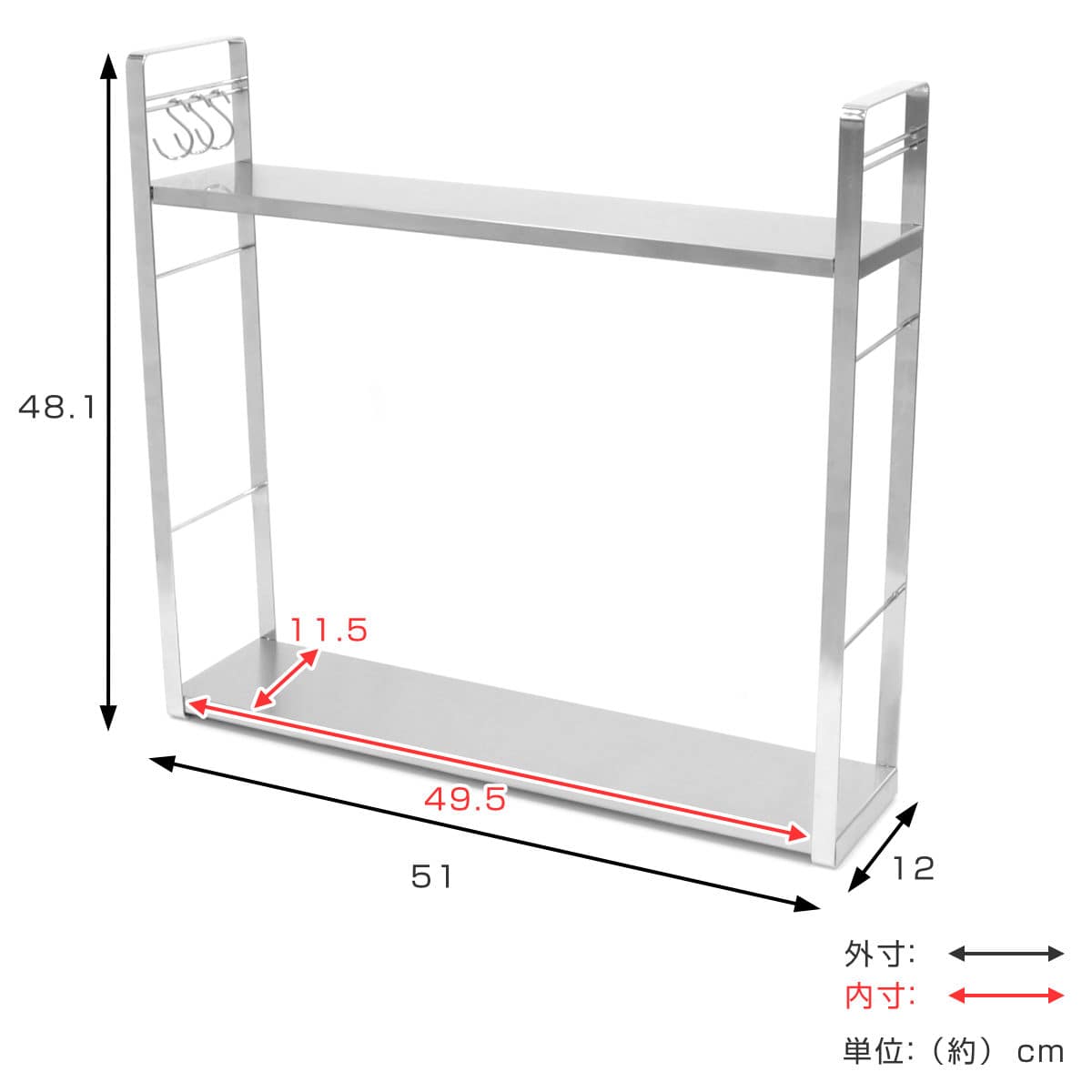 | サイズ | 約 幅51×奥行12×高さ48.1(cm) 棚板内寸:約 幅49.5×奥行×11.5(cm) |