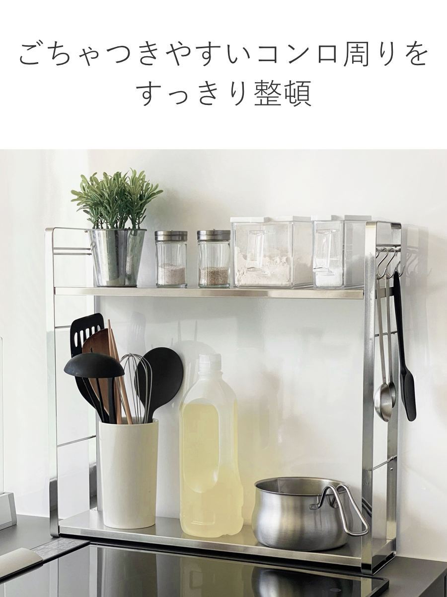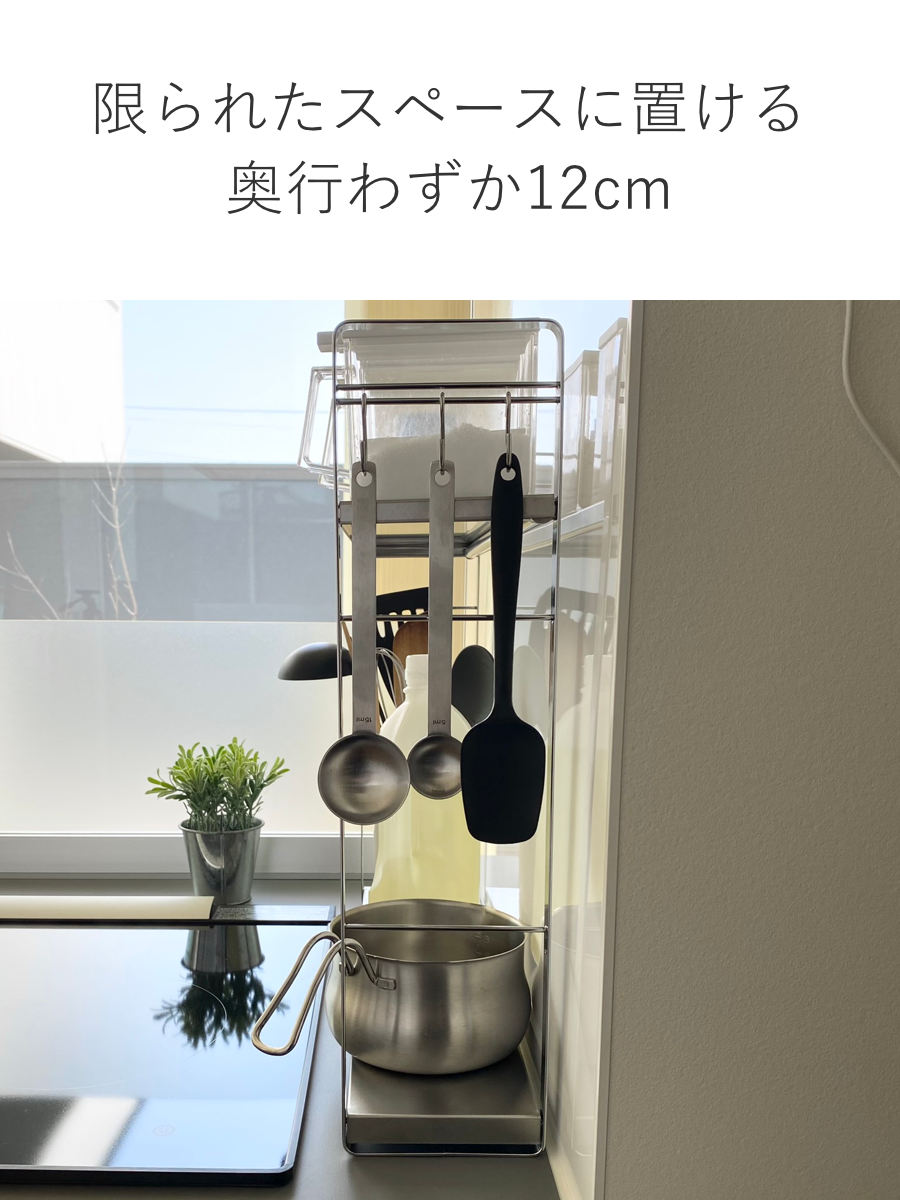 奥行はわずか約12cmとスリムなので、コンロ横やコンロ奥などの限られたスペースに置くことができます。調味料やキッチンツールなどをラックにまとめれば、キッチンがすっきり整います。