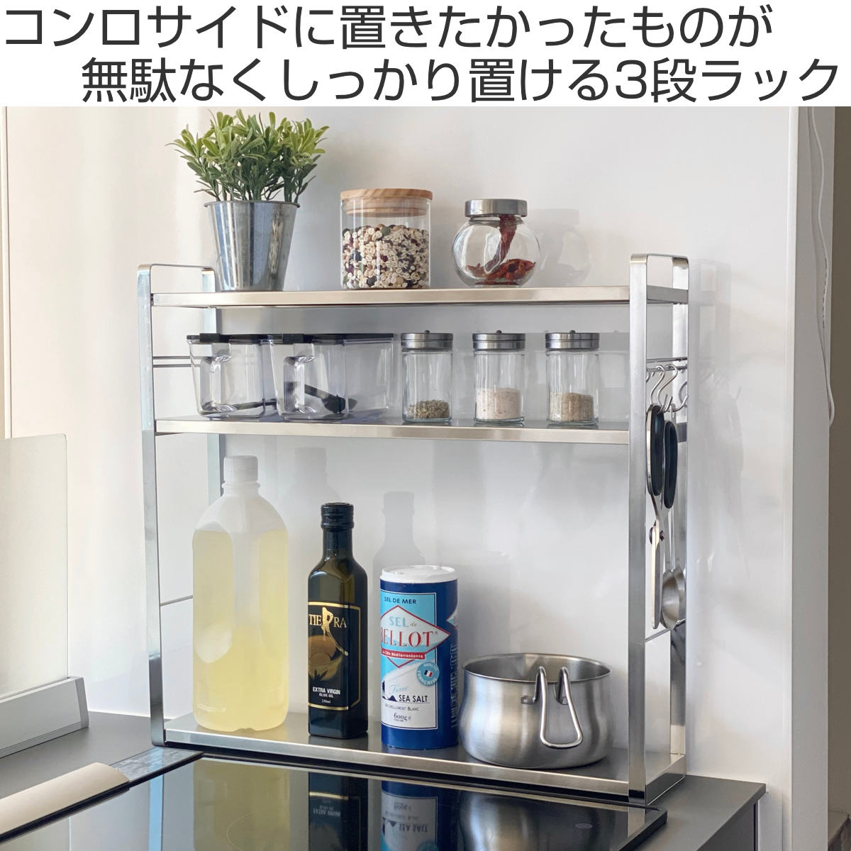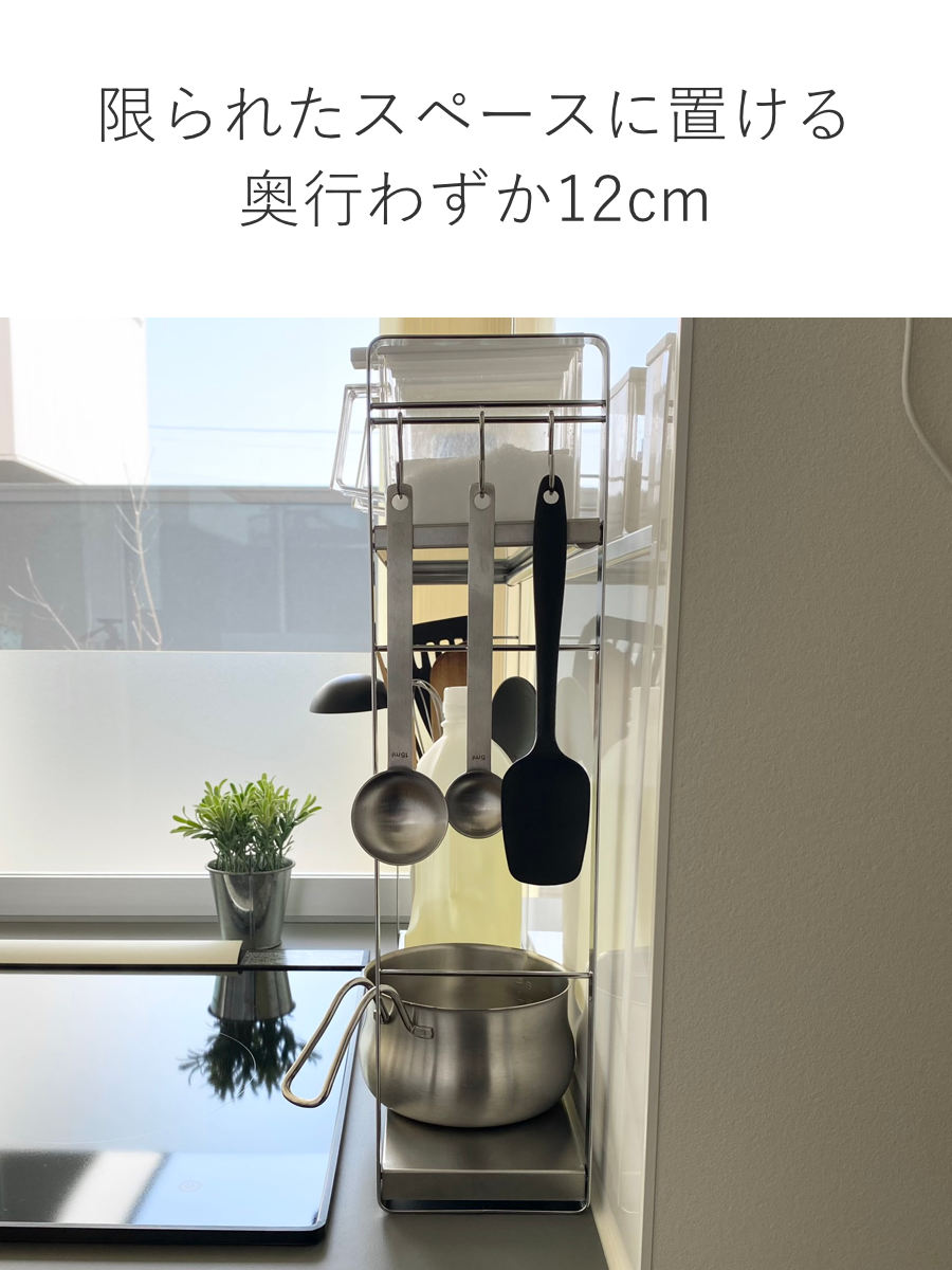 奥行はわずか約12cmとスリムなので、コンロ横やコンロ奥などの限られたスペースに置くことができます。調味料やキッチンツールなどをラックにまとめれば、キッチンがすっきり整います。