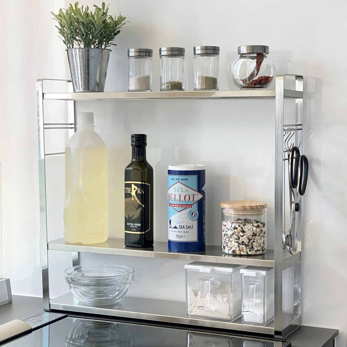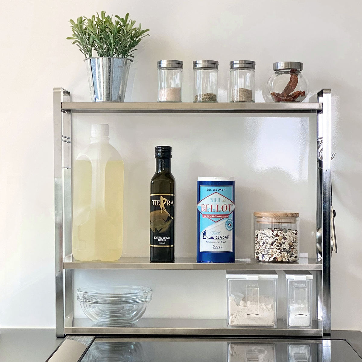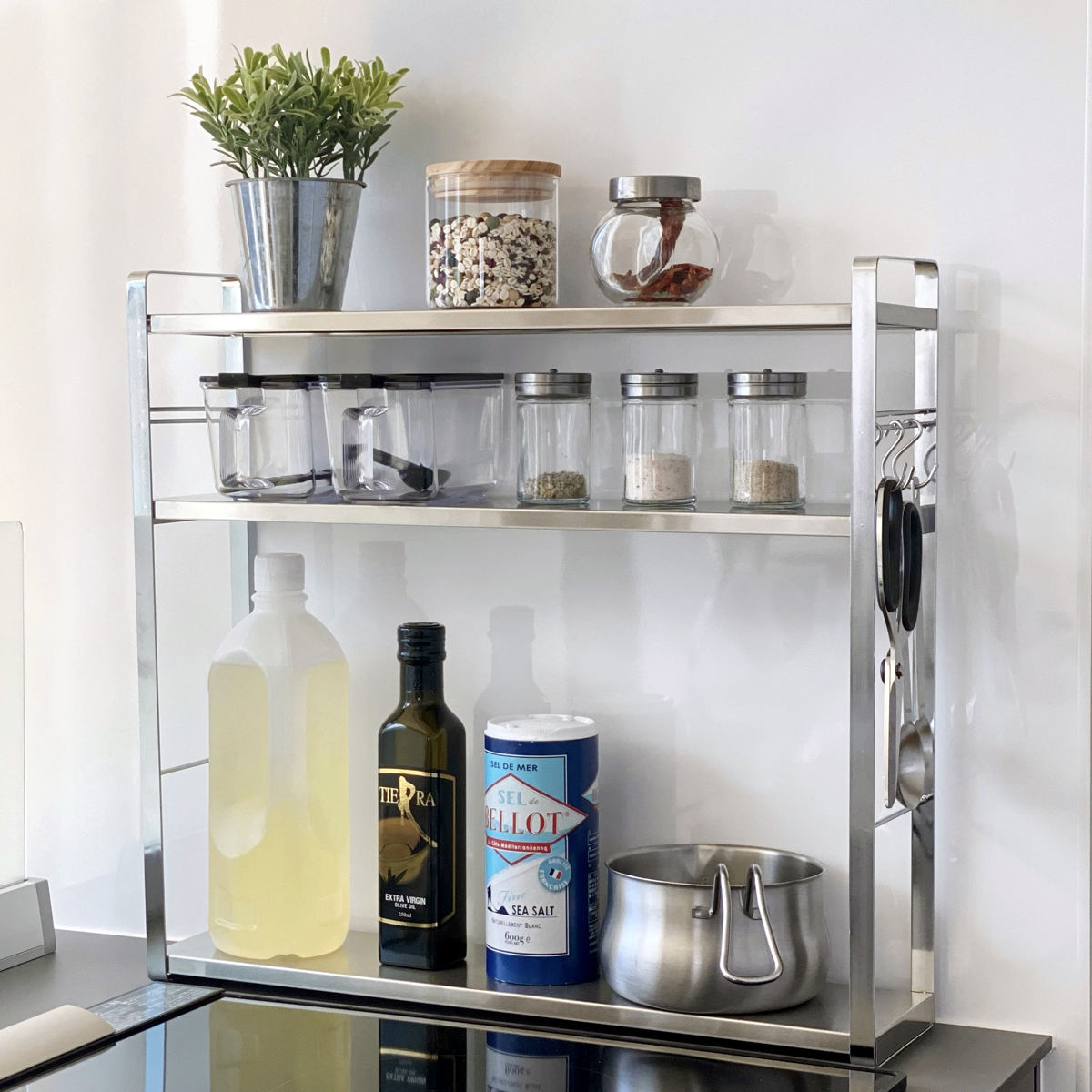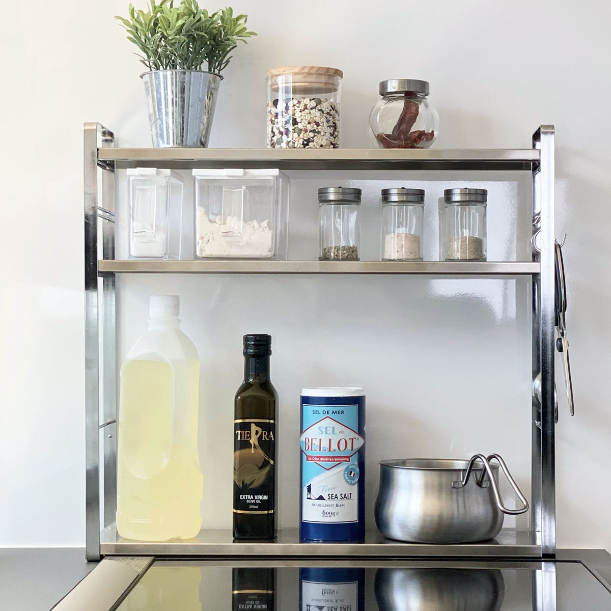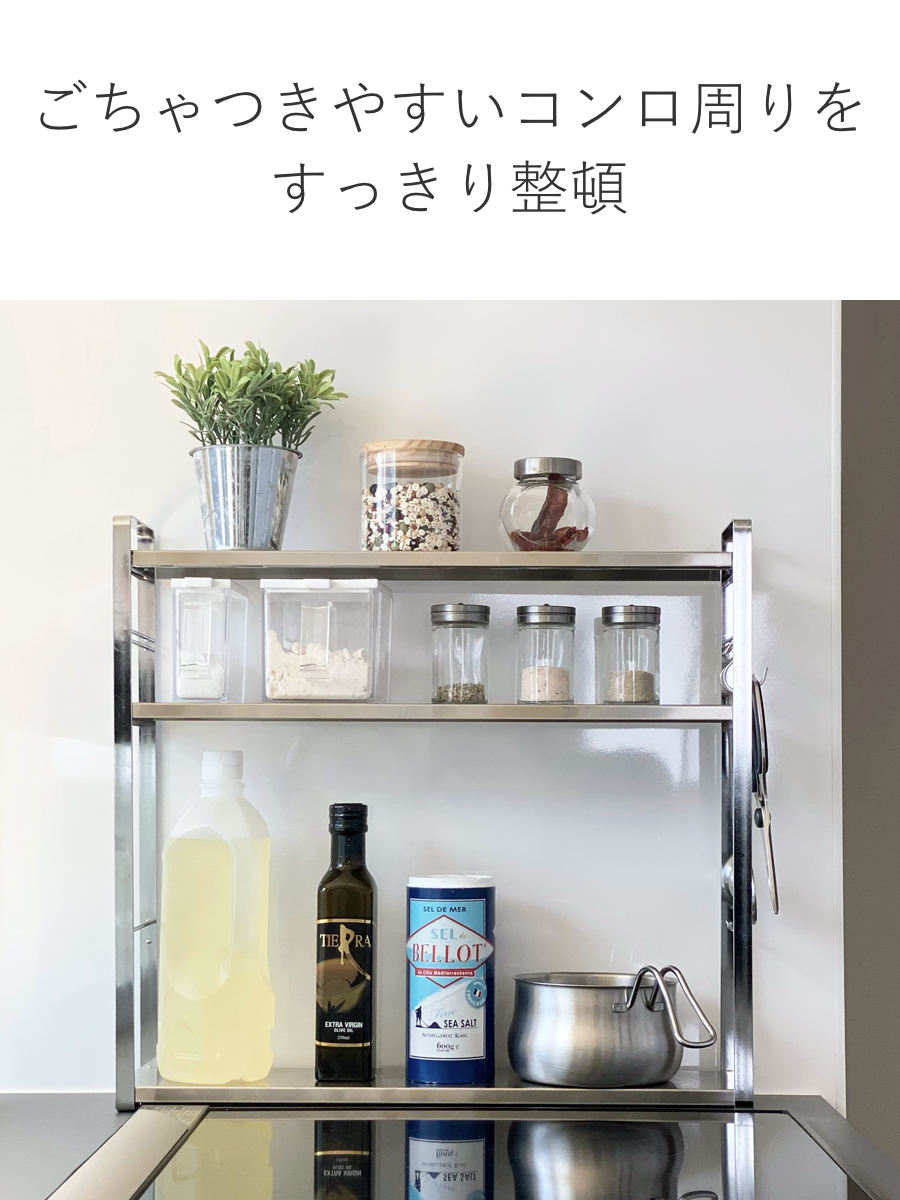 無駄の無いシンプルなフォルムが印象的なキッチンラックです。お料理によく使う調味料やキッチンツールの収納スペースを確保しつつ、すぐ手の届く場所に収納することでより効率的な調理動線を作ることができます。
