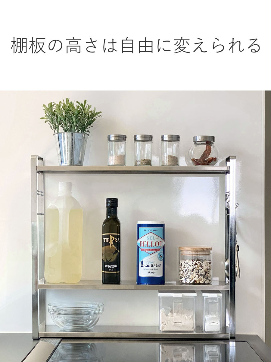棚板の高さが自由に変えられるので、コンロ周りの必需品もきちんと収まります。置きたい物が微妙に高さが合わない、またはスペースを持て余してしまう。そんな悩みを解決できるサイズ感を導き出しました。