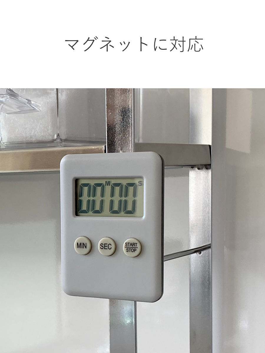 フレームはスチール製なのでマグネット付きのキッチンタイマーやフックなどを付けることができます。