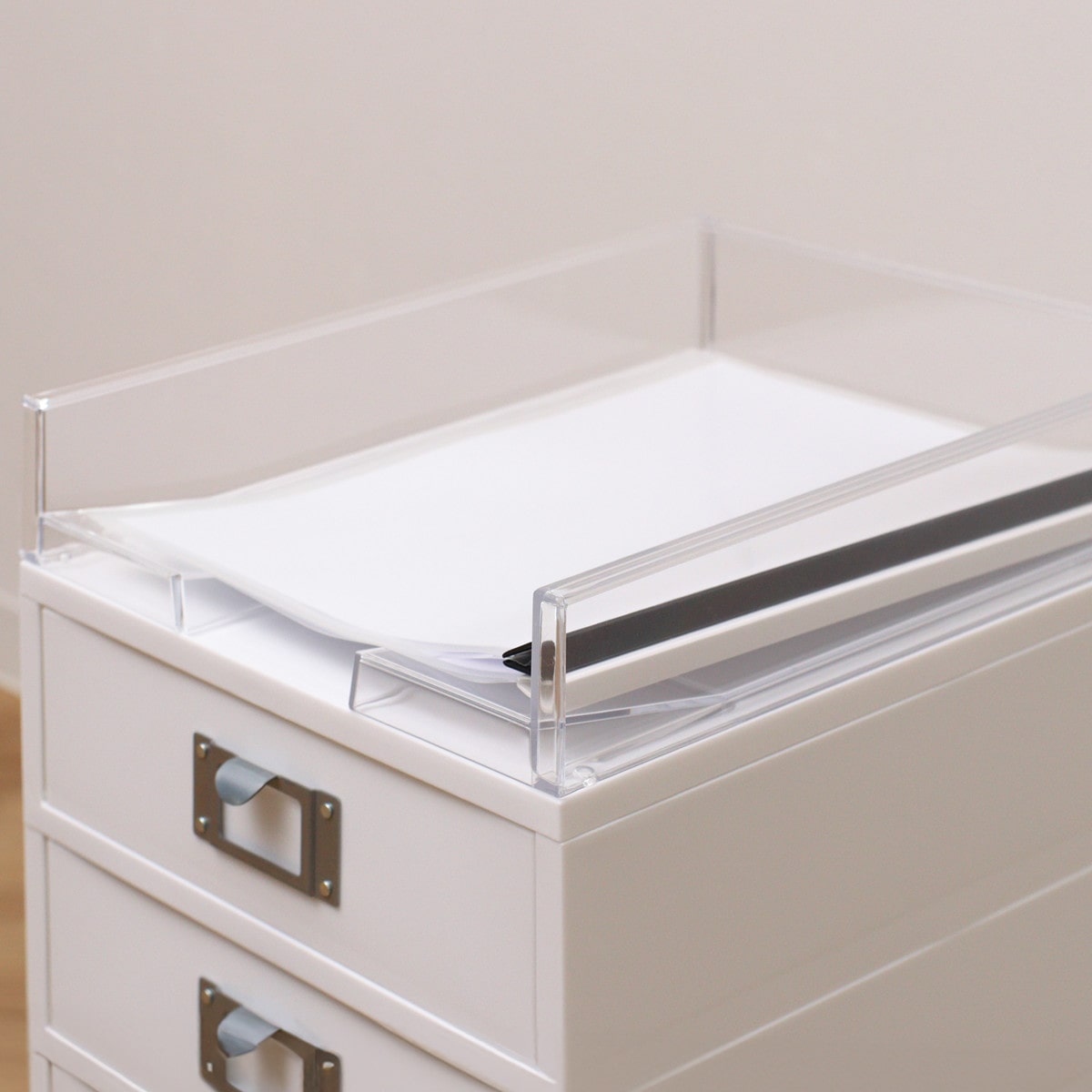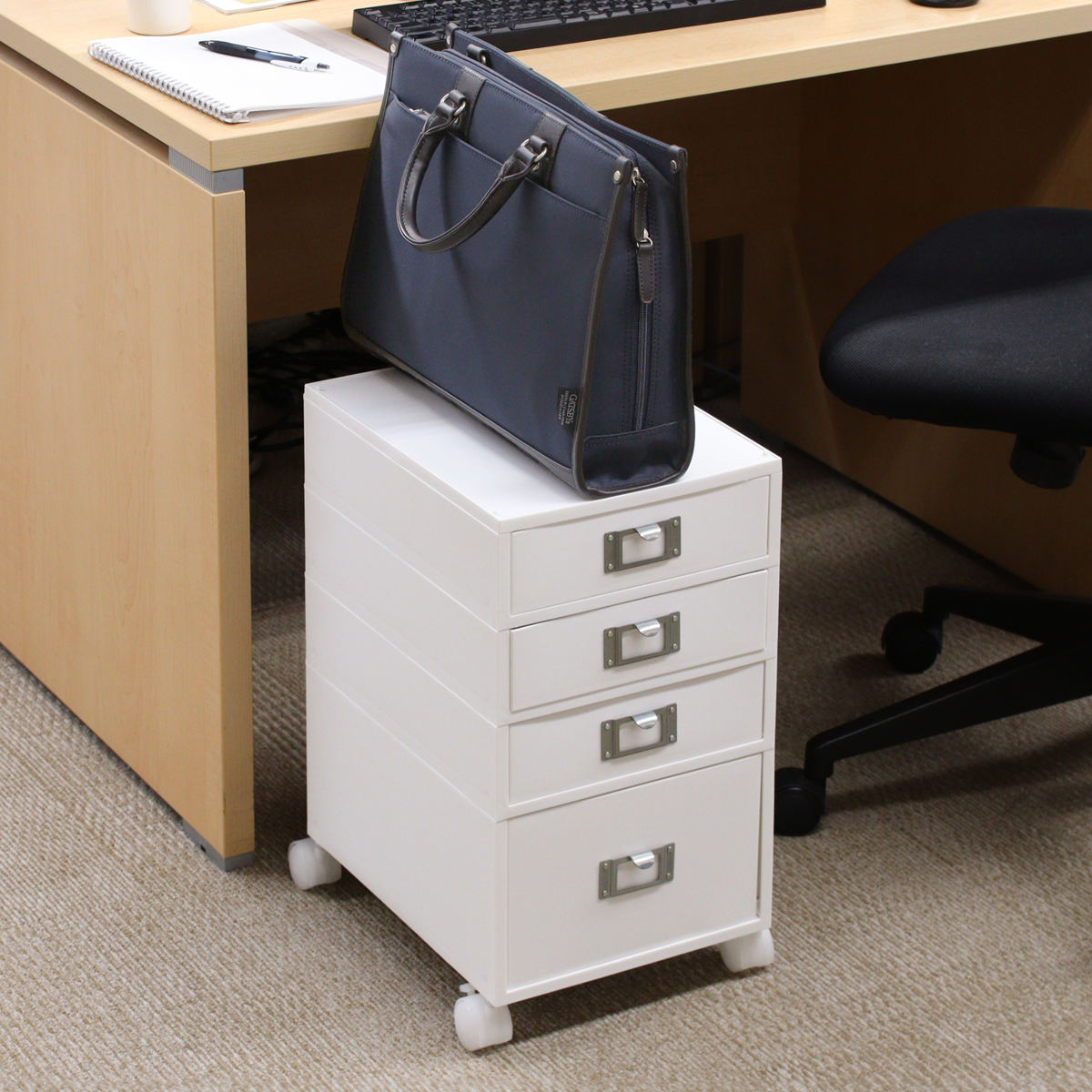 幅約26cmとスリムなので、引出しのないデスクサイドや、リビング・ダイニングテーブルの下に置いても邪魔になりません。在宅ワーク、フリーアドレススタイルを取り入れたオフィスでの使用にも重宝します。