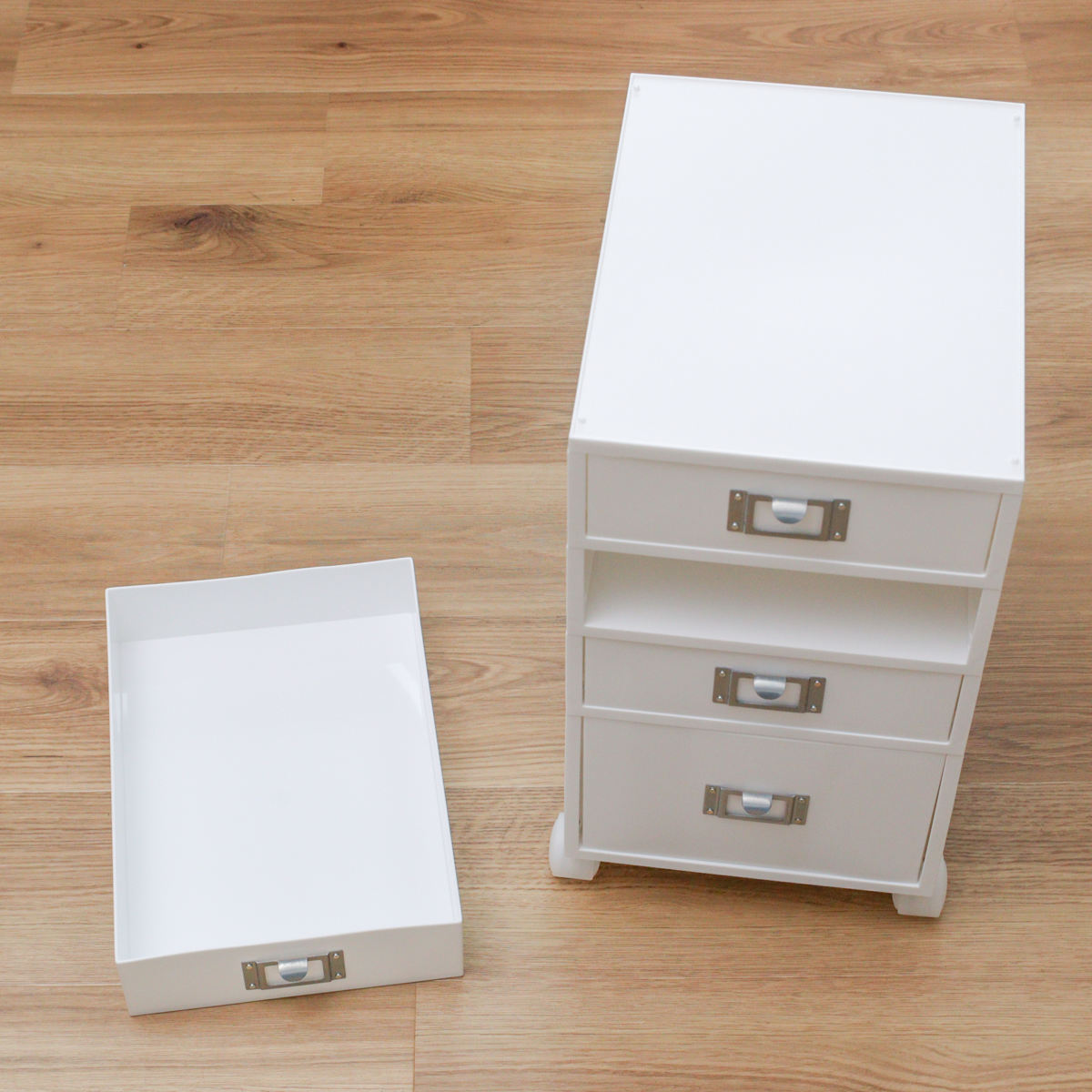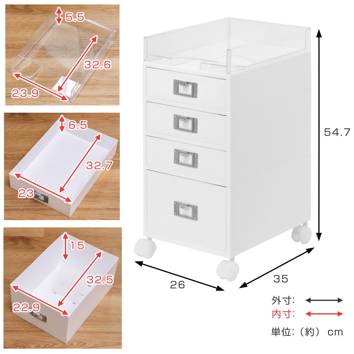 A4の浅型引出し3段、深型引出し1段、トレーが付いた大容量サイズです。
