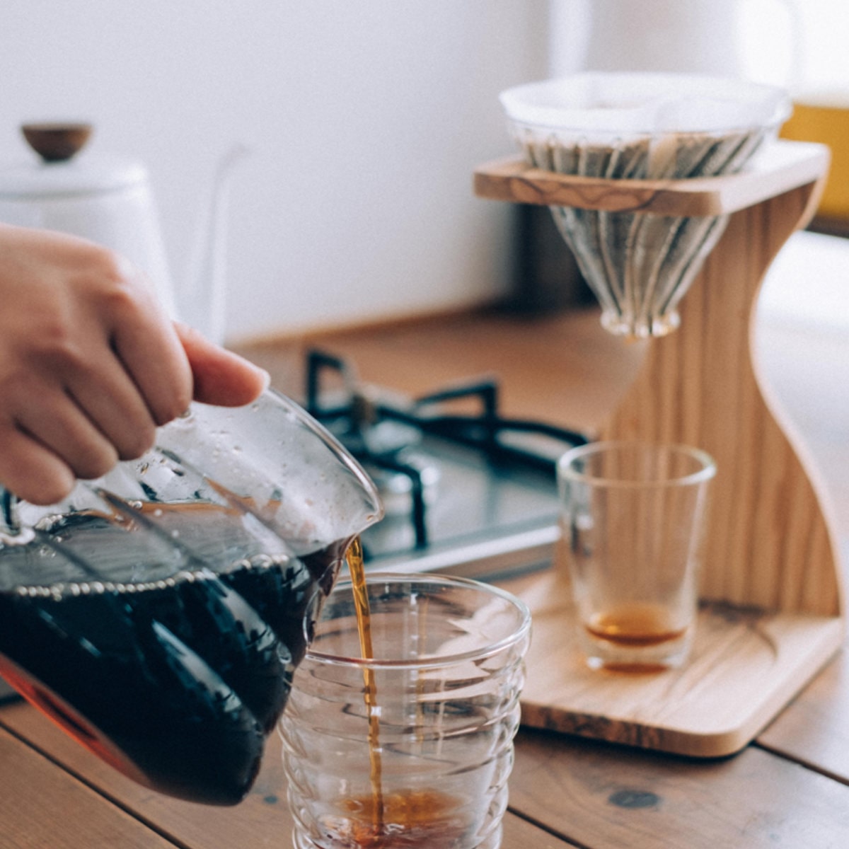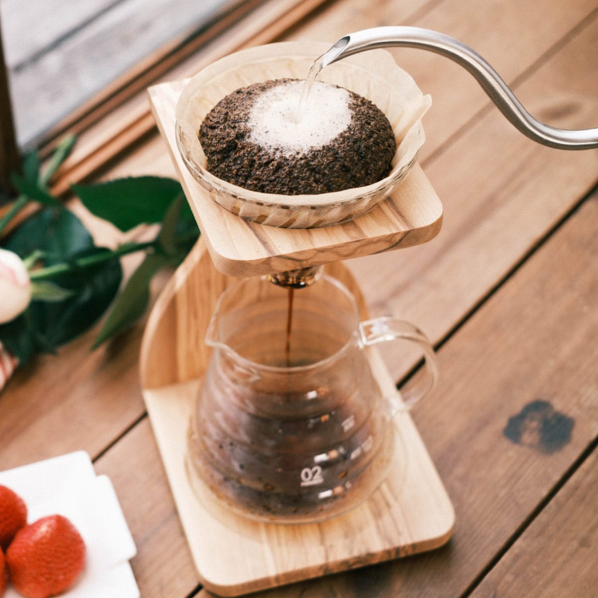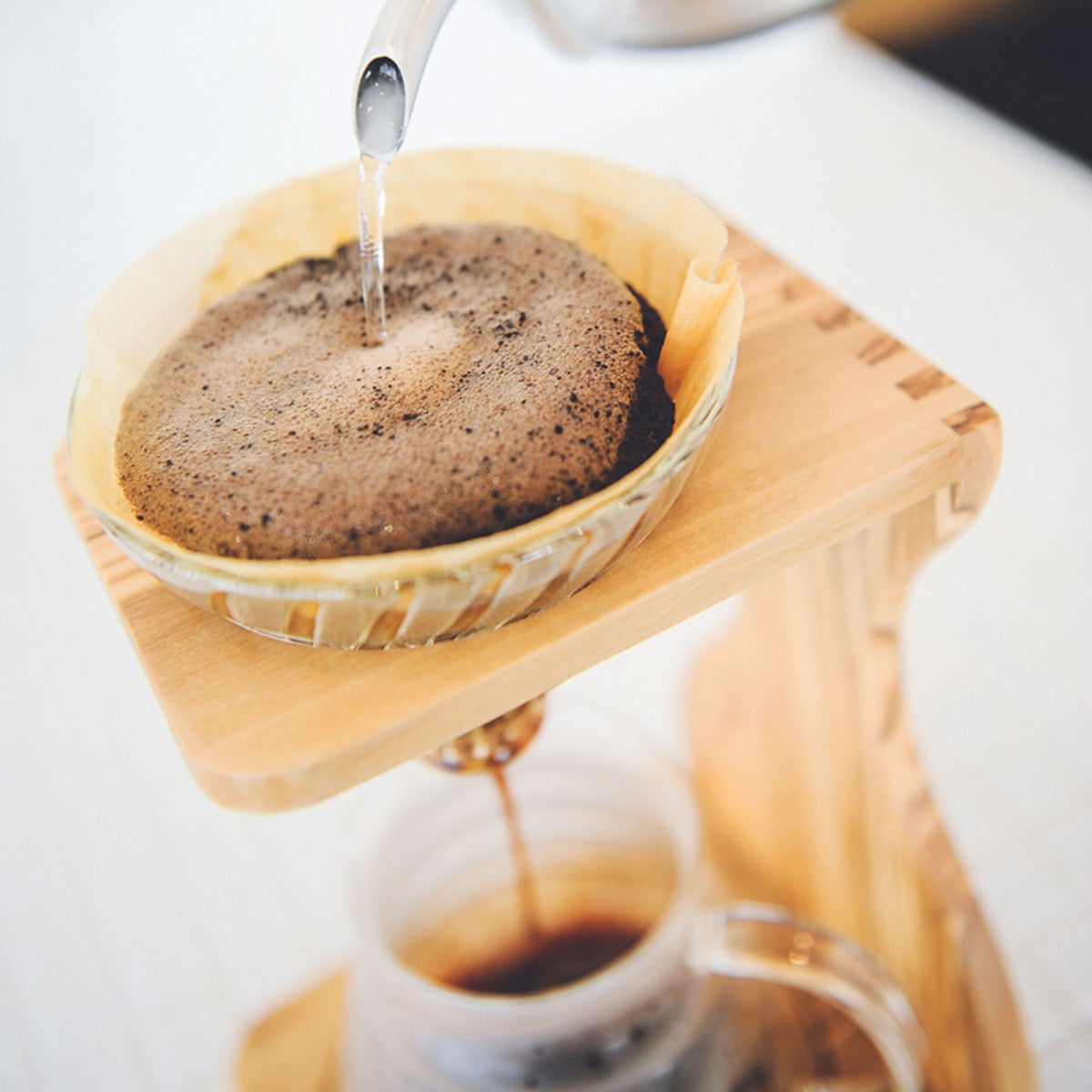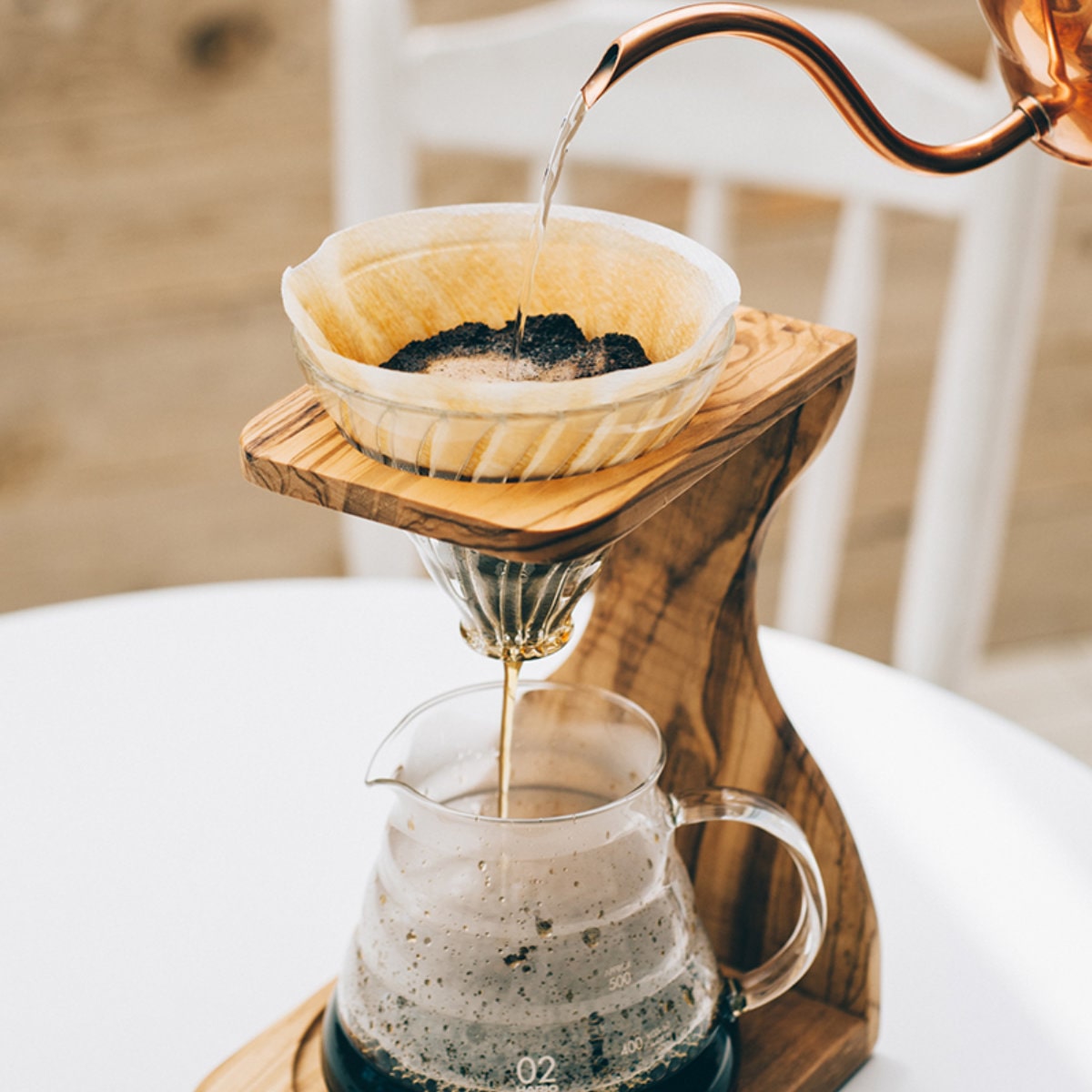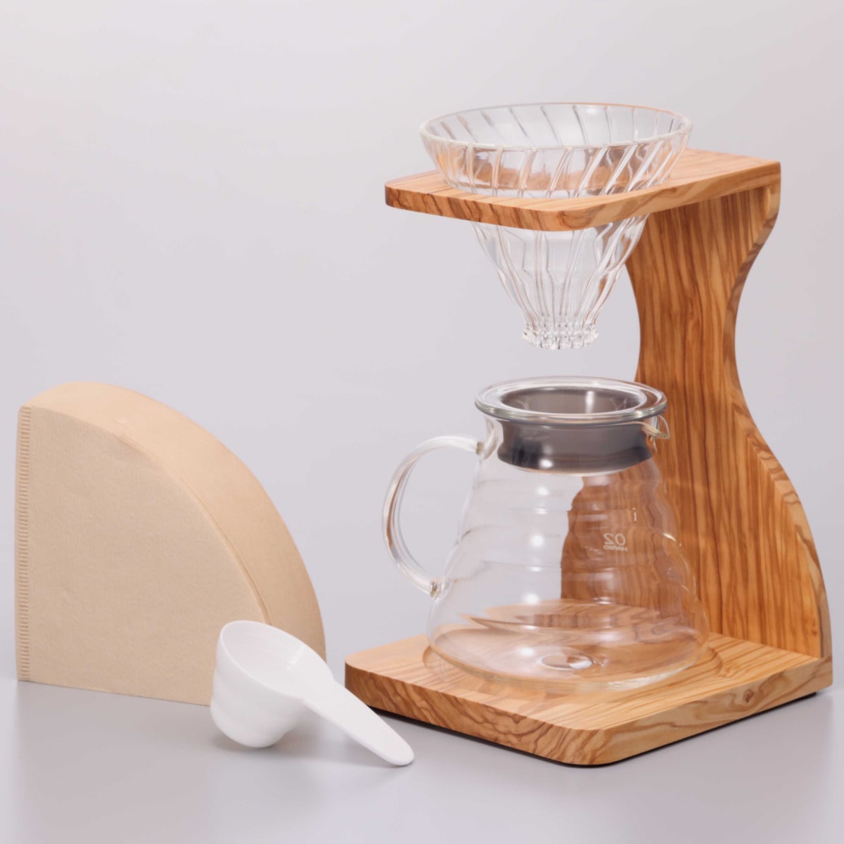 サーバー・ドリッパー・ウッドスタンド・軽量スプーン・コーヒーフィルターのセットです。1~4杯分のコーヒーを抽出できます。オリーブウッドを使用したスタンドはインテリアに馴染むナチュラルなデザインです。
