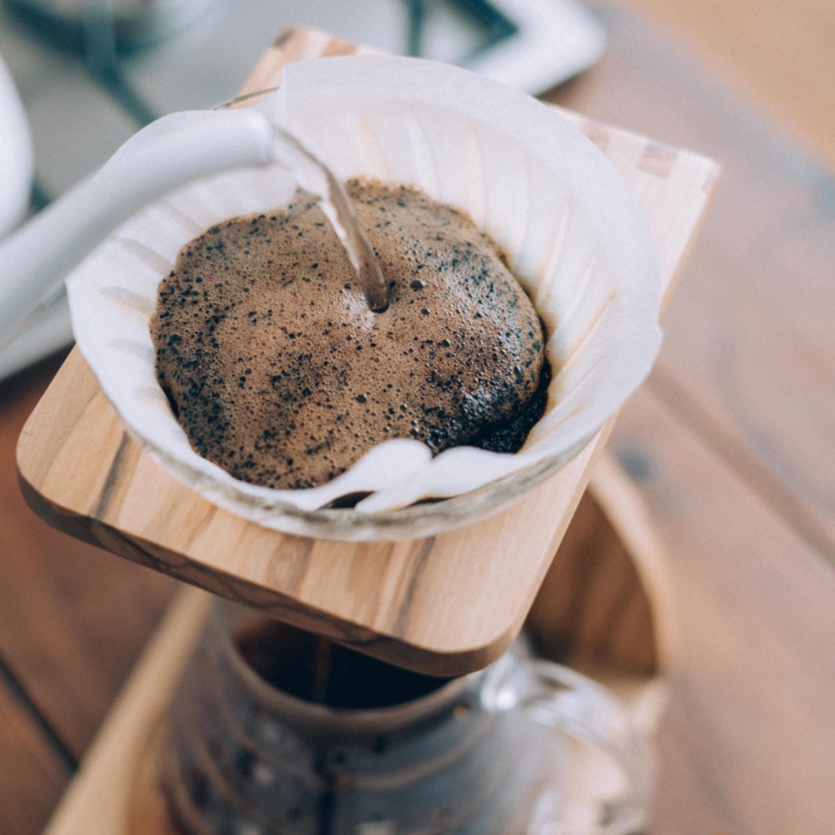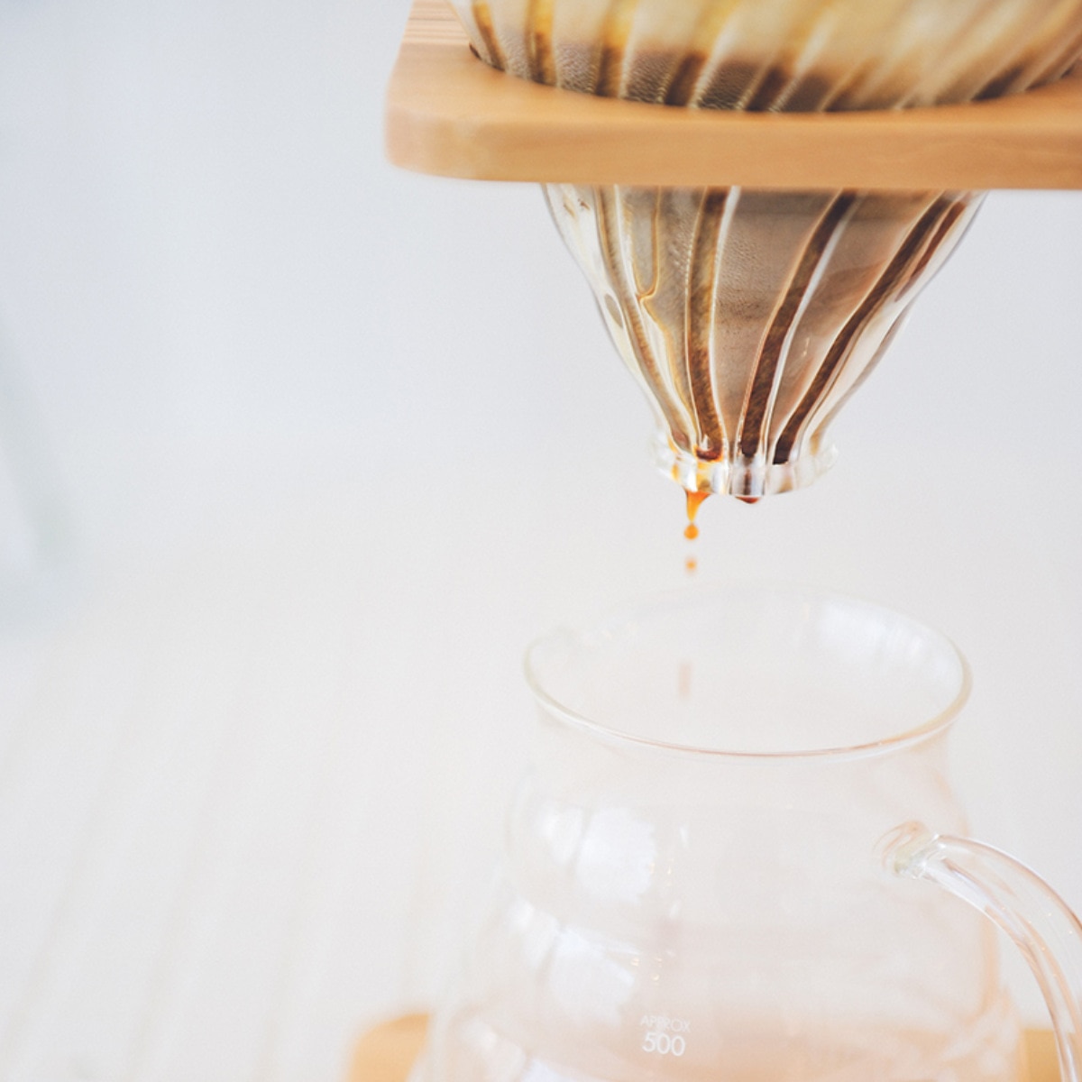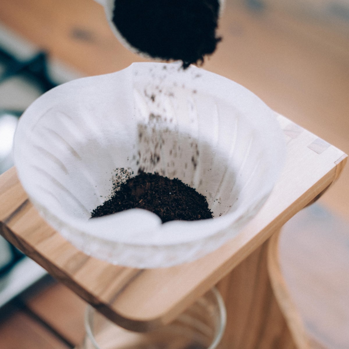 V型円すい形のペーパーフィルターは、コーヒー粉の層が深く、注いだお湯が円すいの頂点に向かって流れるため豆の旨味をしっかり抽出できます。