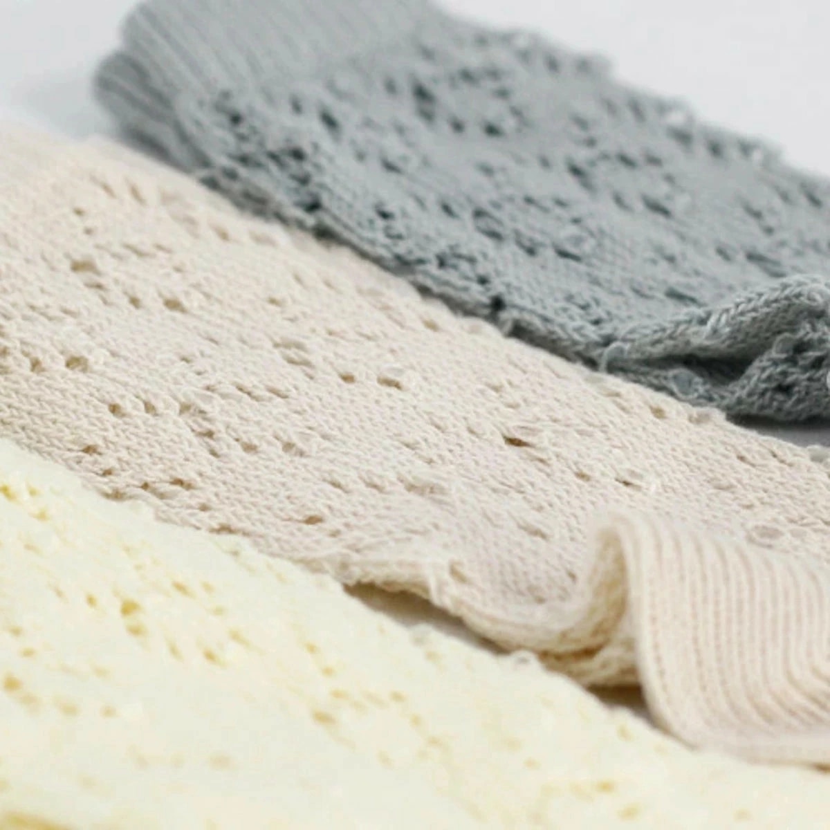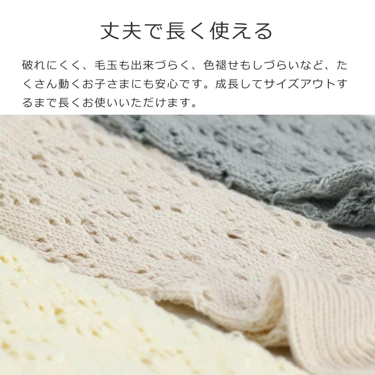 全体に繊細な透かし編みが施されています。柔らかく伸縮性があるので、お子様の成長期や体型に左右されません。