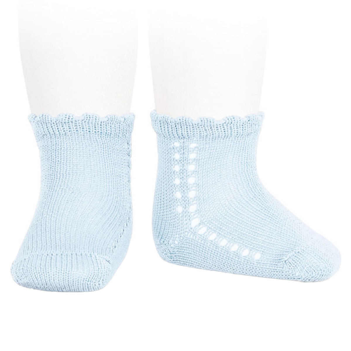 くるぶしあたりまで2本のライン、足側面は1本のライン状の透かし模様が施されたシンプルな子ども用靴下です。ふくらはぎ下程度までの短め丈(ロークルーソックス)で、ワンピースからパンツまでどんなスタイルにも合わせられます。