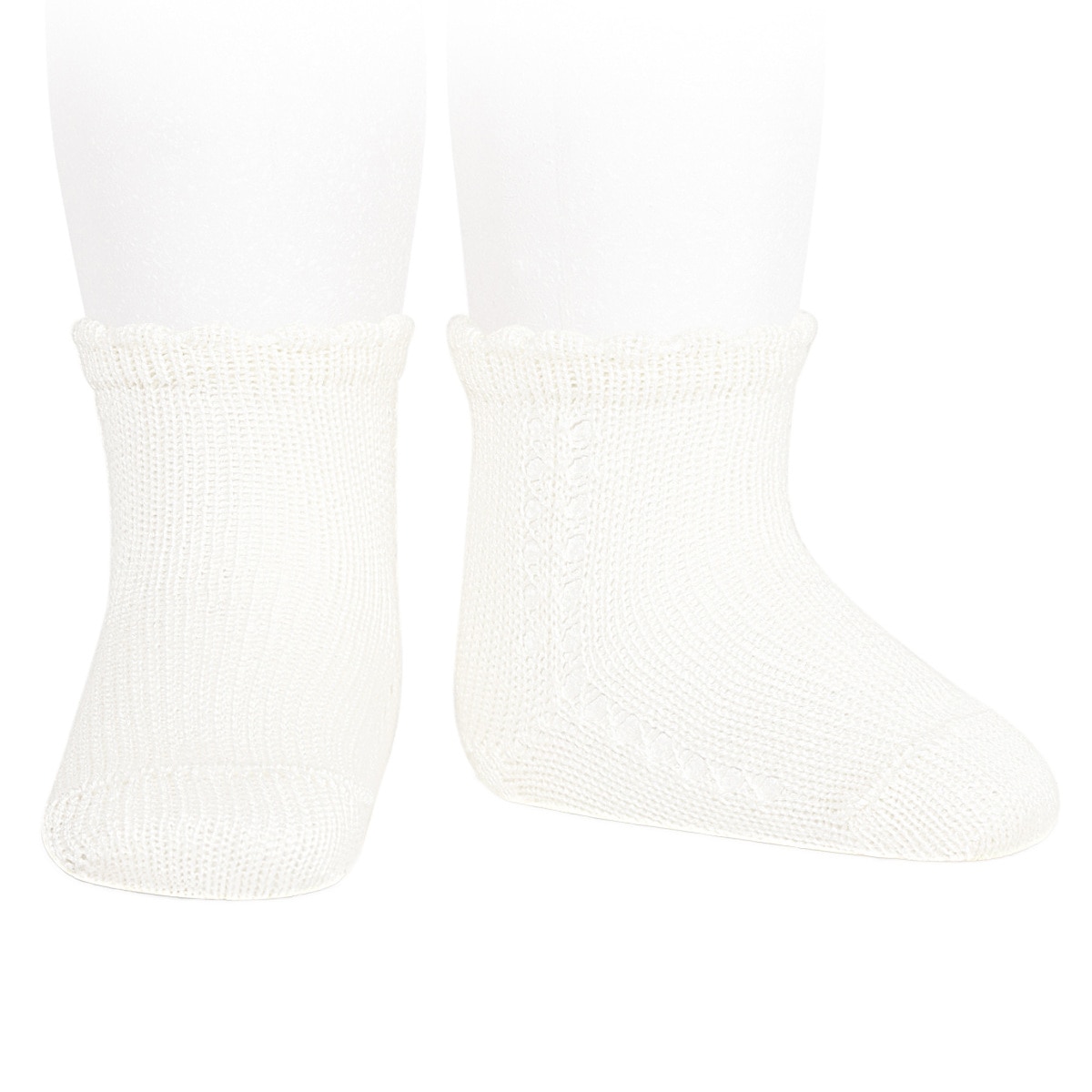 くるぶしあたりまで2本のライン、足側面は1本のライン状の透かし模様が施されたシンプルな子ども用靴下です。ふくらはぎ下程度までの短め丈(ロークルーソックス)で、ワンピースからパンツまでどんなスタイルにも合わせられます。