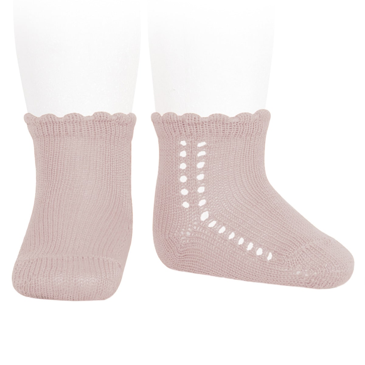 くるぶしあたりまで2本のライン、足側面は1本のライン状の透かし模様が施されたシンプルな子ども用靴下です。ふくらはぎ下程度までの短め丈(ロークルーソックス)で、ワンピースからパンツまでどんなスタイルにも合わせられます。