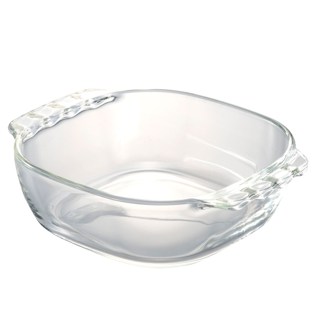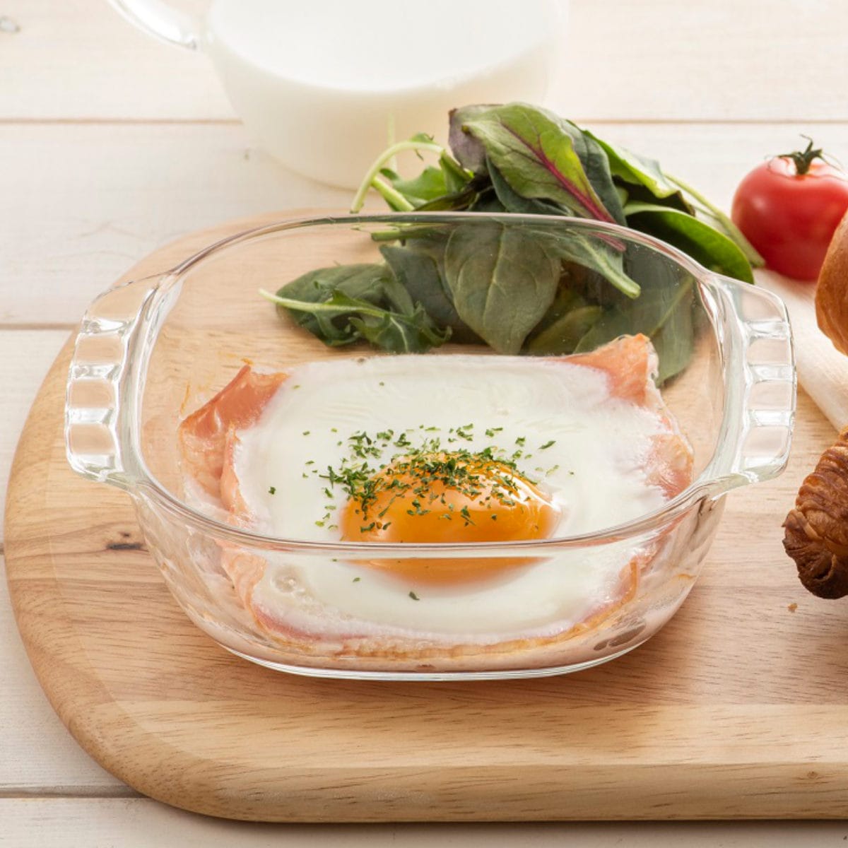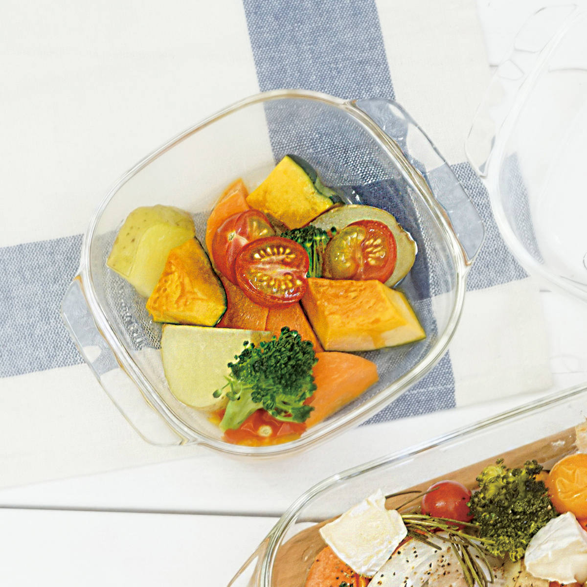 シンプルなデザインのガラス製なので、調理後そのまま器として食卓へ出すことができます。オーブン料理はもちろん、おかずからお菓子まで幅広くご使用いただけます。副菜や取り分け用など、日常使いのお皿としても使いやすいサイズです。