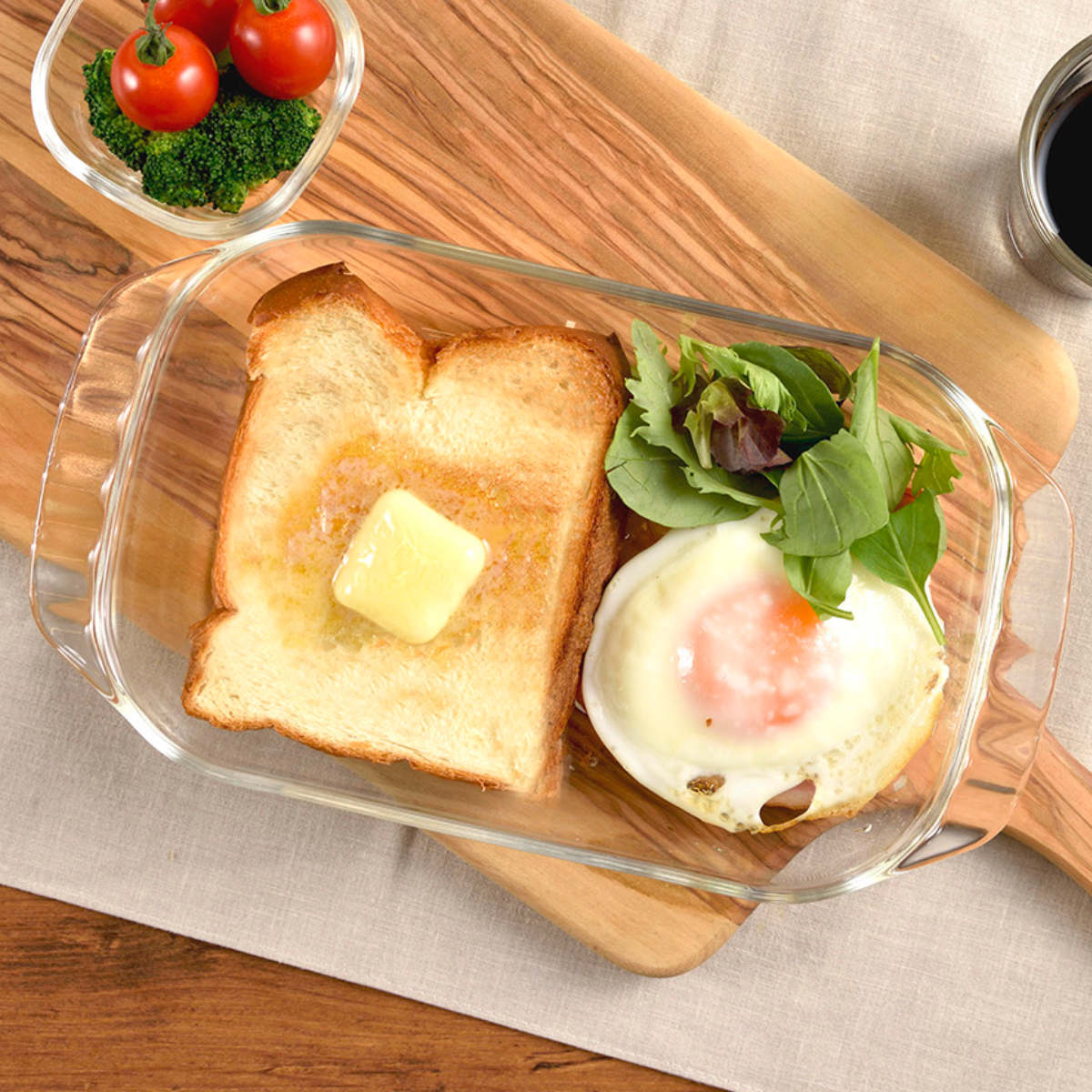 ニオイや色移りがしにくい、耐熱ガラス製のトースター皿です。ガラスの透明感がお料理の彩りを引き立て、食卓を明るく華やかに演出します。