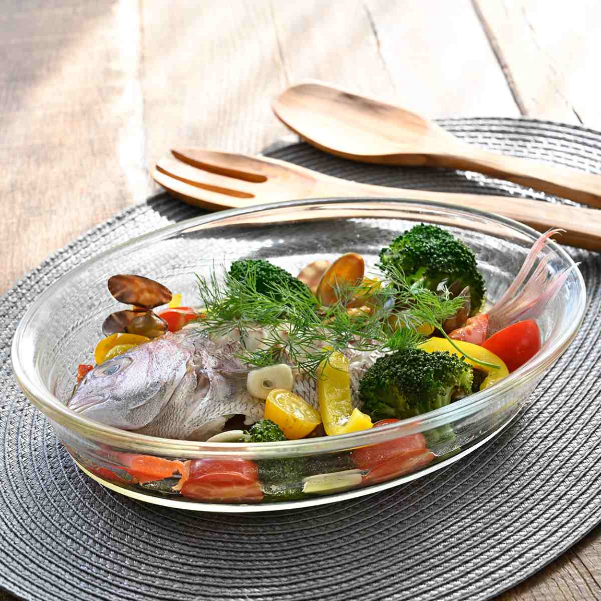 100年続いた耐熱ガラスの技術「HARIO Glass」を用いたオーバル皿です。1.1Lと大容量で、魚丸ごと1匹を使ったアクアパッツァやグラタンなど、大皿感覚でご使用いただけます。調理や温めなおしが終わったら、できたてをすぐに食卓へ運べます。