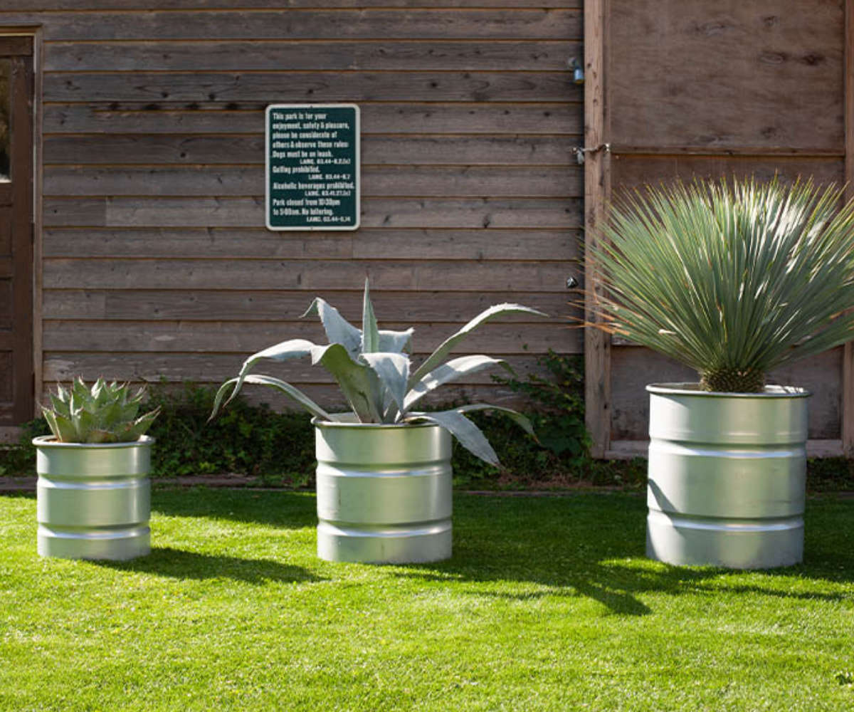約 直径42.2cm×高さ45cmの大型のプランターです。本体はガルバナイズドされた無骨でシンプルなデザインです。