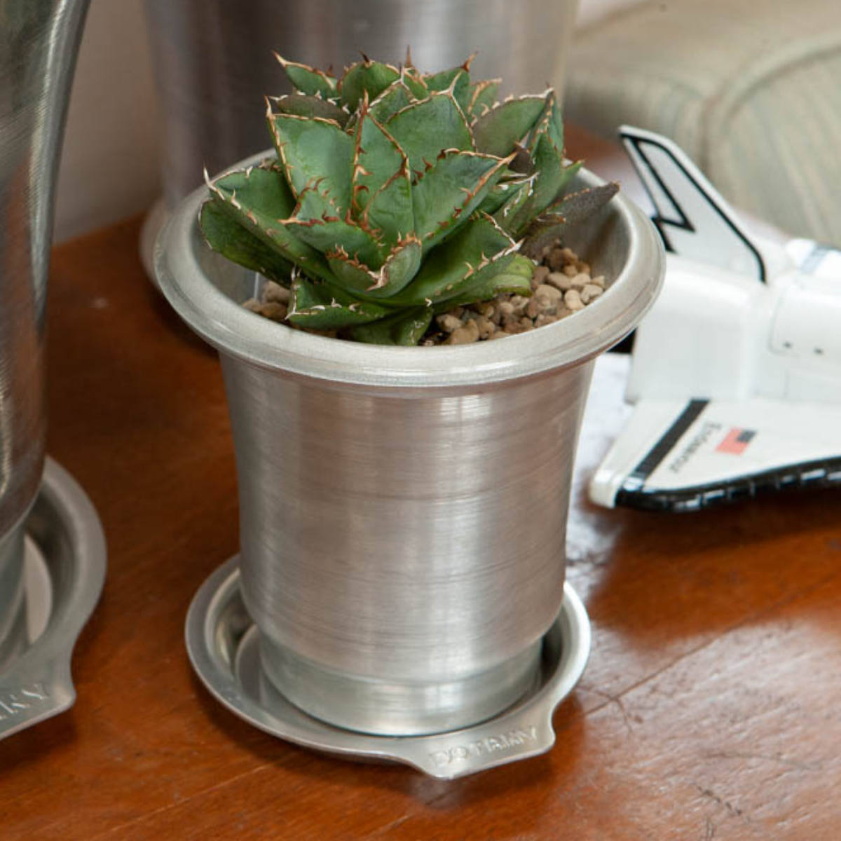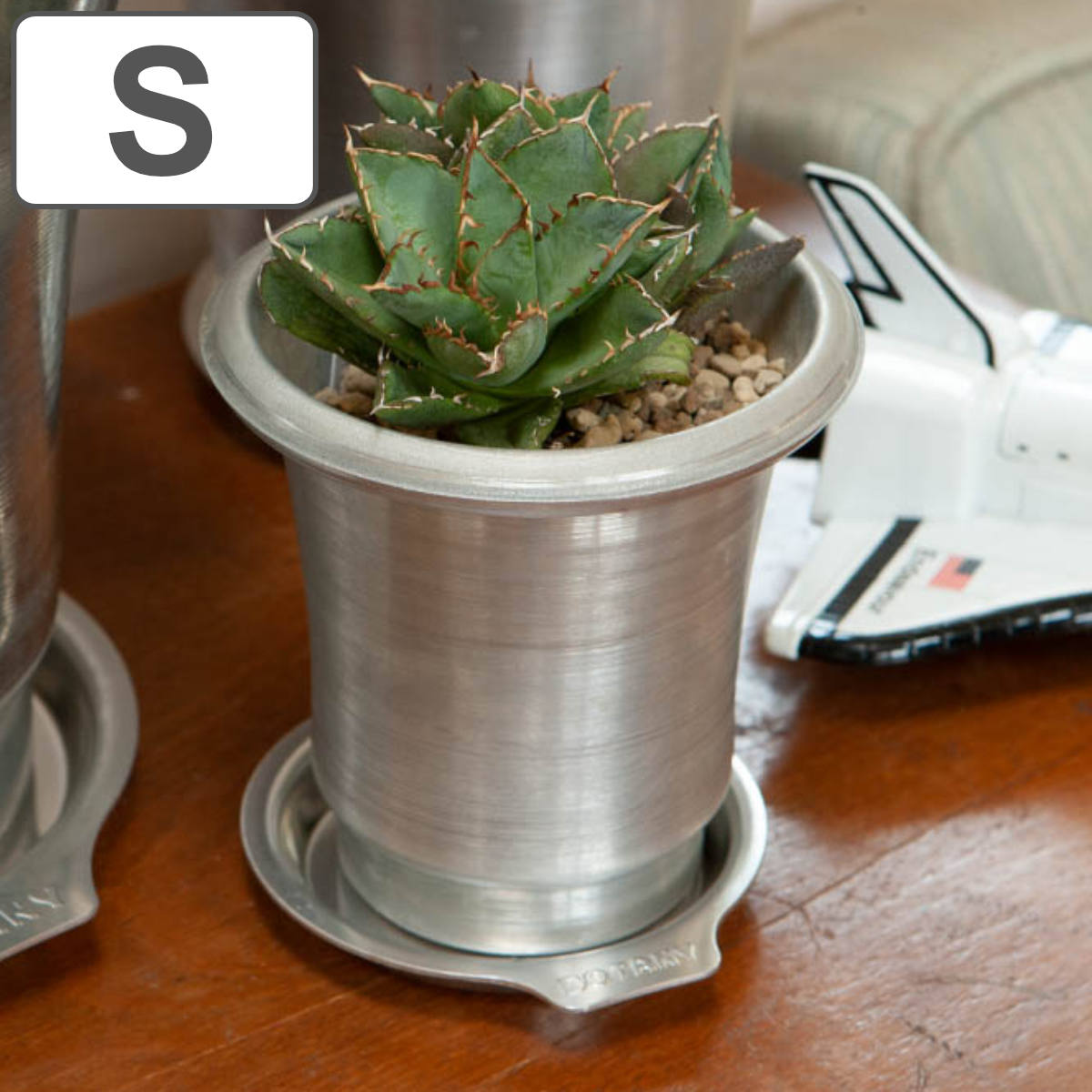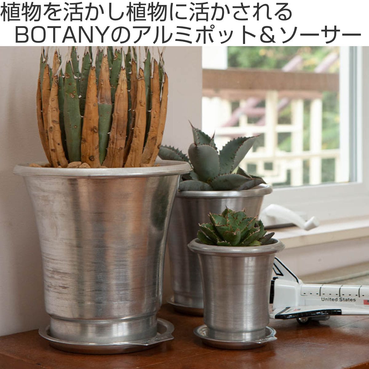 多肉植物植物にぴったりなアルミポットです。工業製品を彷彿とさせるラフでタフな質感でサボテンやアガベといった個性的な植物にピッタリです。
