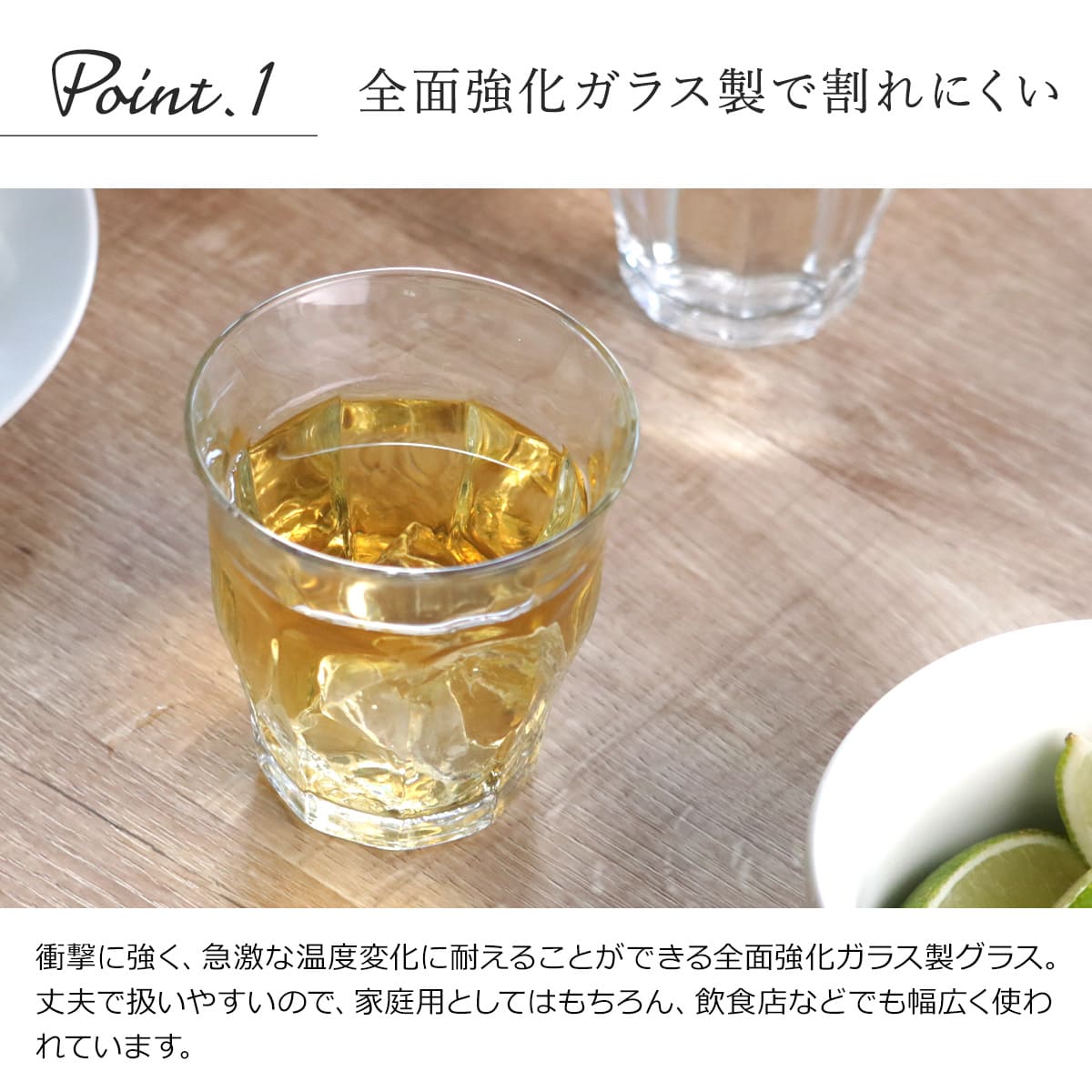 衝撃に強く、急激な温度変化に耐えることができる全面強化ガラス製のグラス。