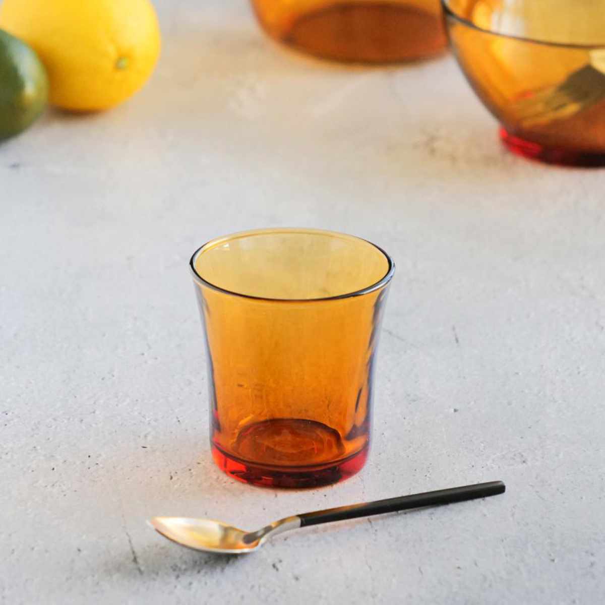 レトロな雰囲気がお洒落なアンバーカラーのグラスです。耐熱性があり、アイスにもホットにも使えます。小さめサイズで飲み物はもちろん、前菜やデザートも美しく盛り付けられ、晩酌用にはロックグラスとしても使えます。