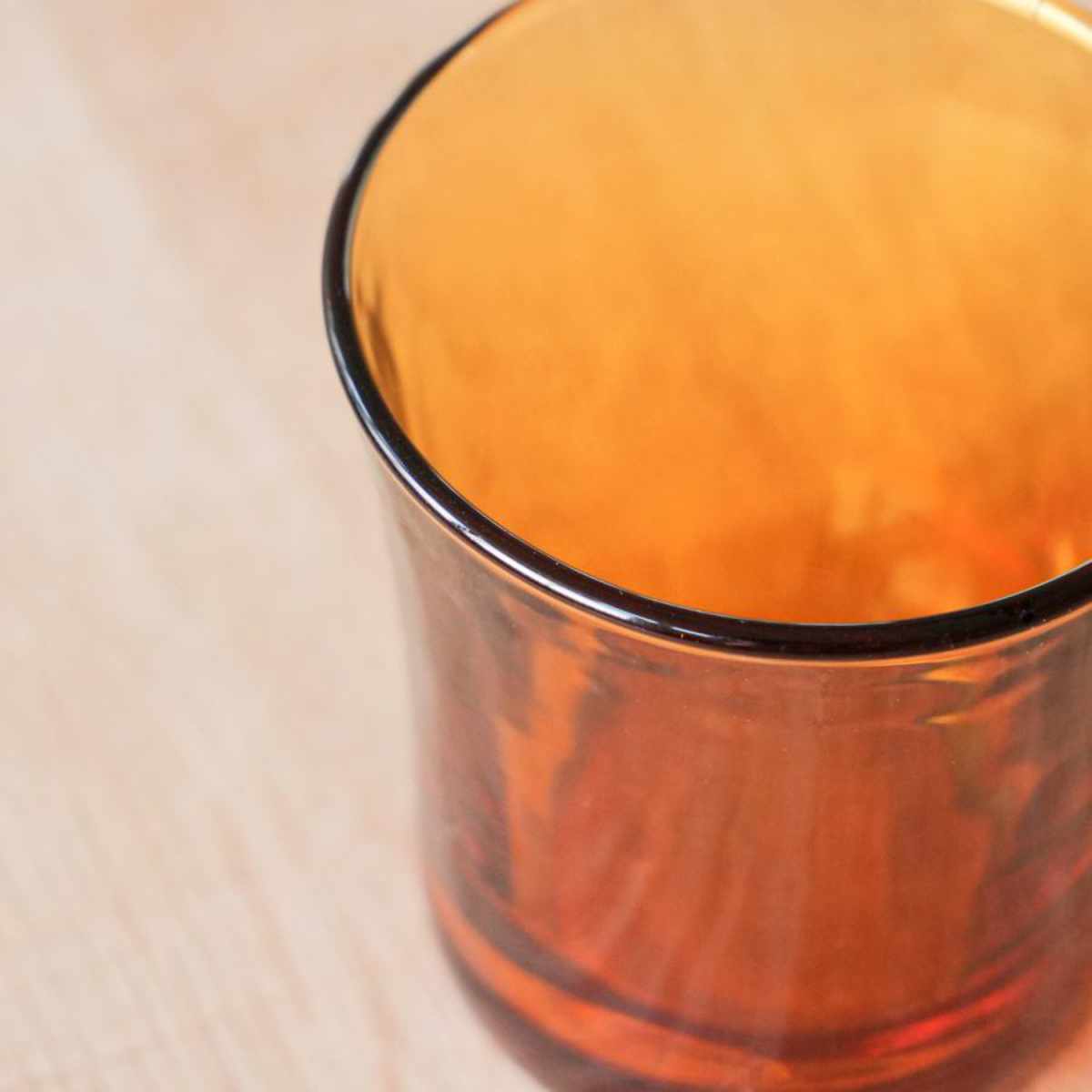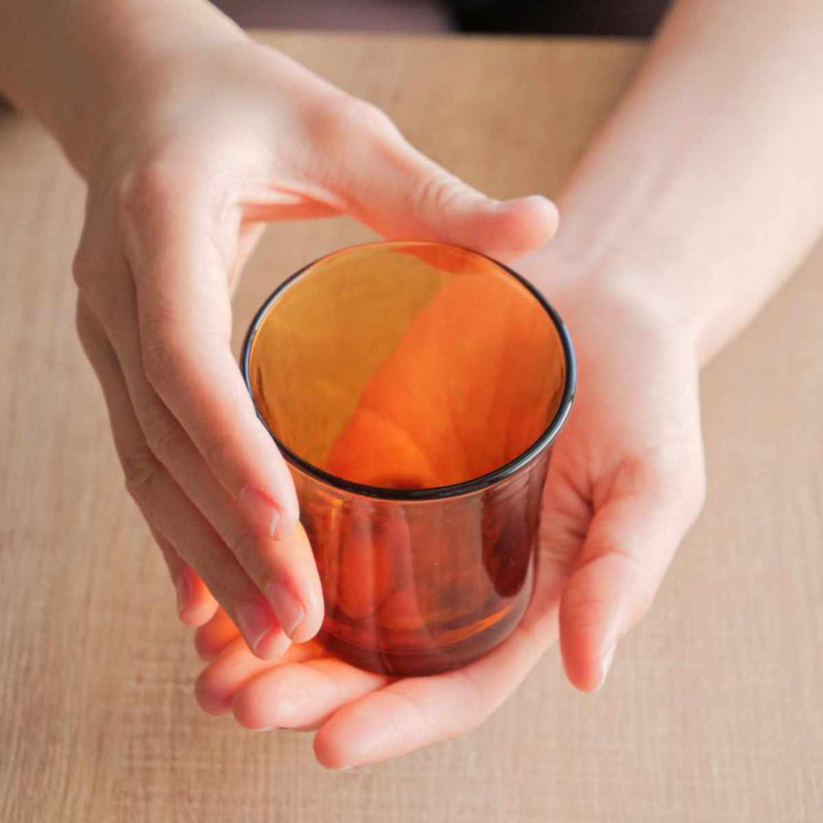 レトロな雰囲気がお洒落なアンバーカラーのグラスです。耐熱性があり、アイスにもホットにも使えます。小さめサイズで飲み物はもちろん、前菜やデザートも美しく盛り付けられ、晩酌用にはロックグラスとしても使えます。