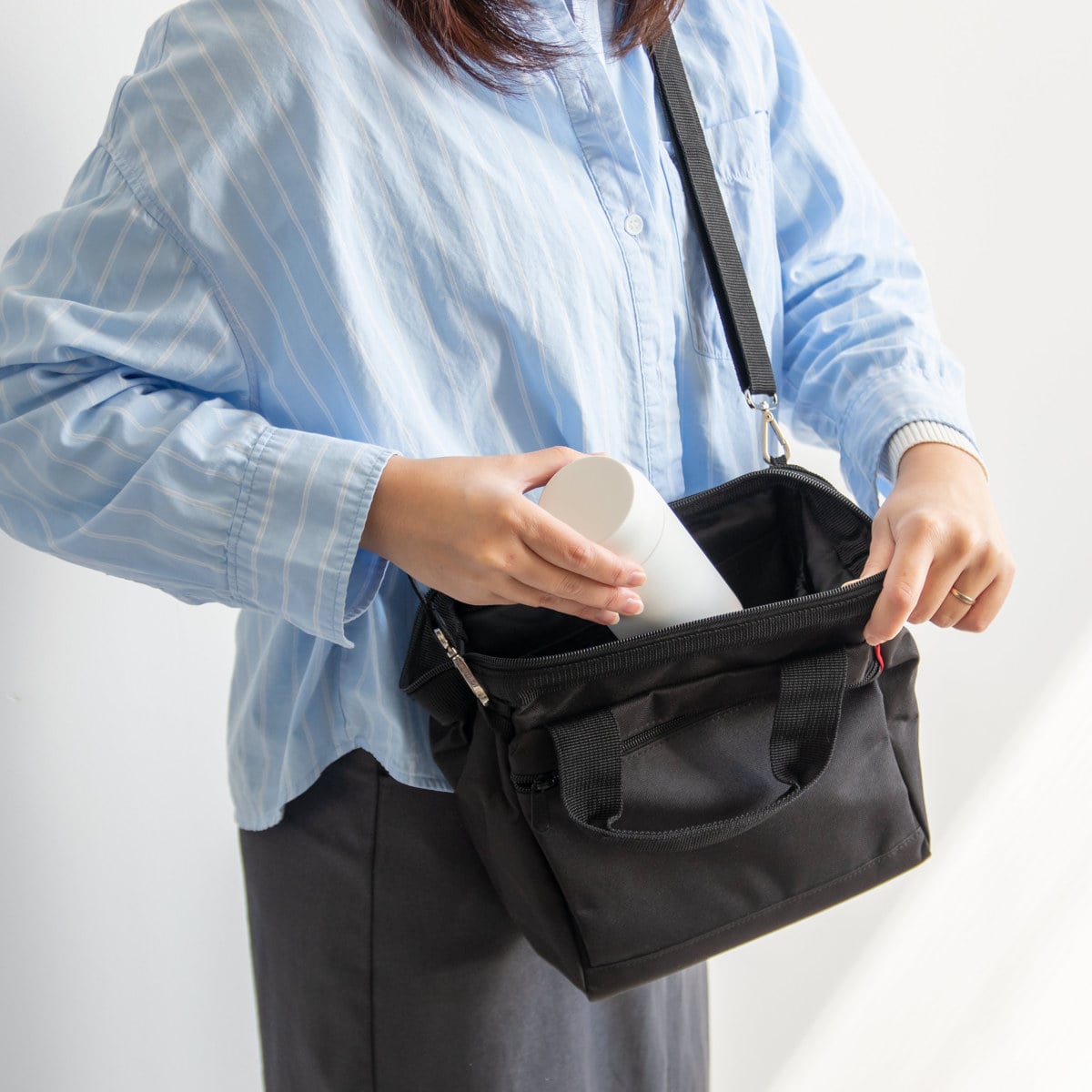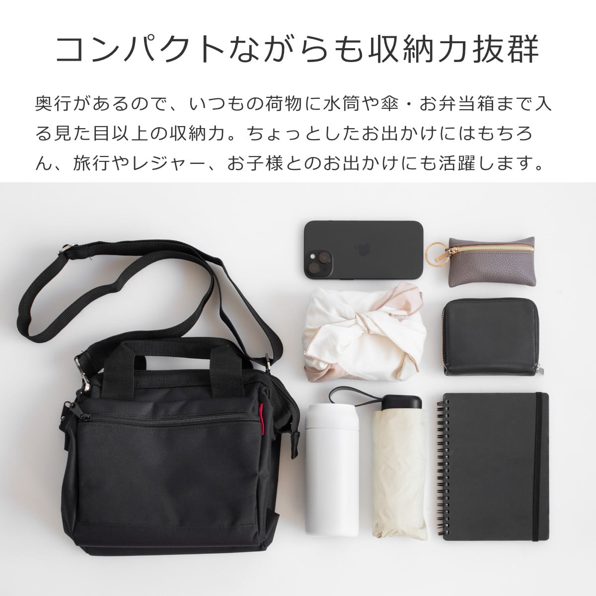 コンパクトですがしっかりと奥行があるので、いつもの荷物に水筒や傘・お弁当箱まで入り、見た目以上に収納力があります。ちょっとしたお出かけにはもちろん、旅行やレジャー、お子様とのお出かけにも活躍します。