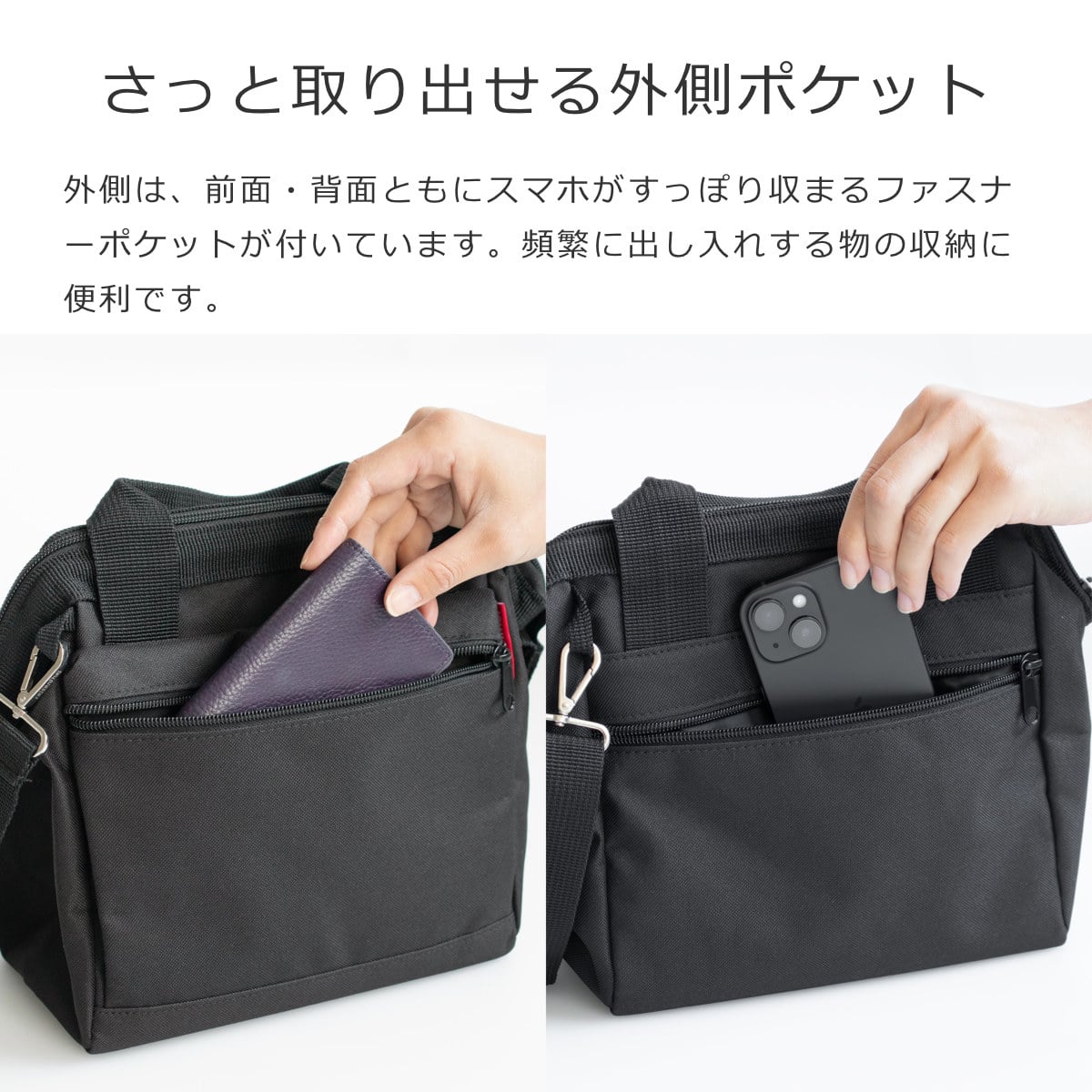 外側は、前面・背面ともにスマホがすっぽり収まるファスナーポケットが付いています。頻繁に出し入れする物の収納に便利です。