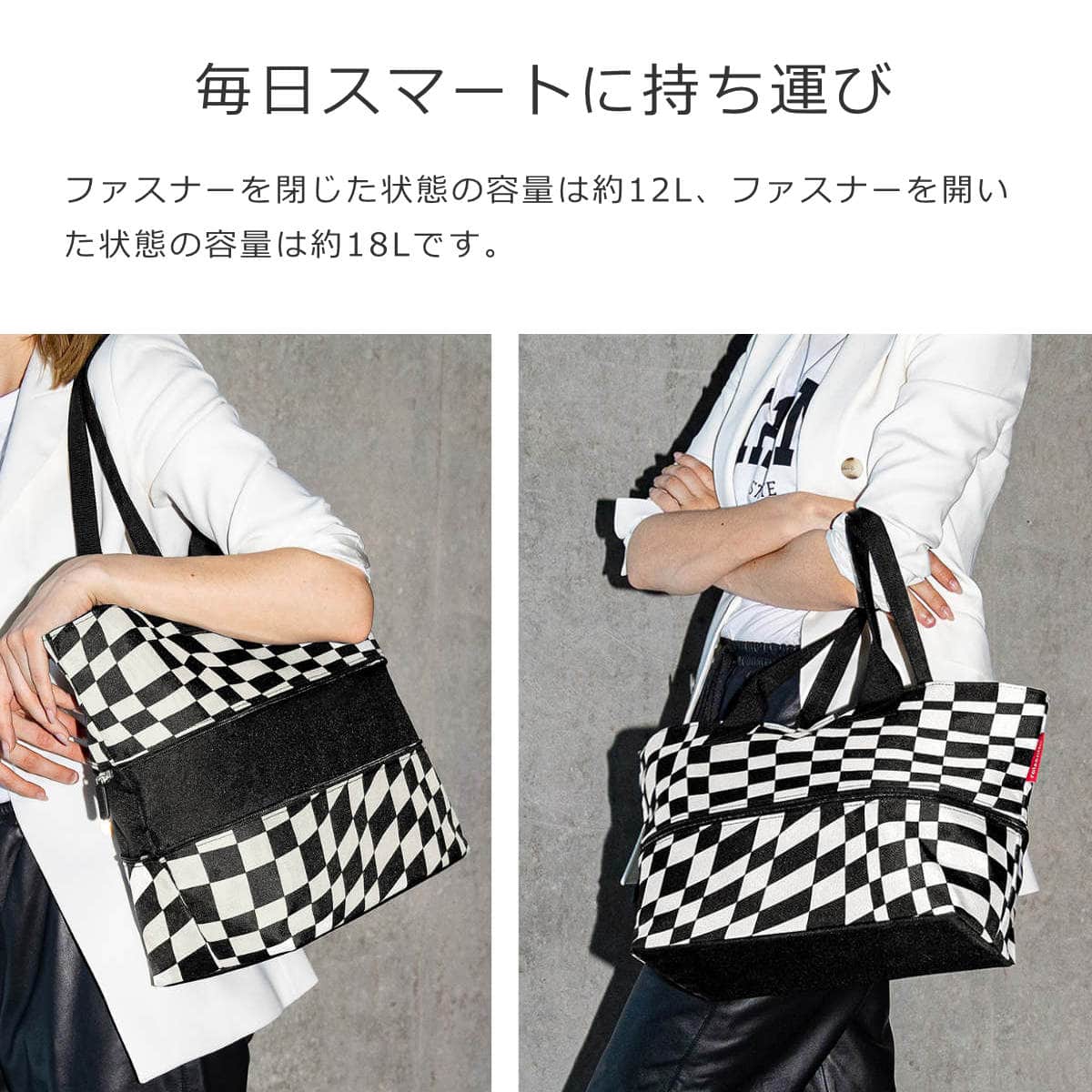 ファスナーを閉じた状態の容量は約12L、ファスナーを開いた状態の容量は約18Lです。