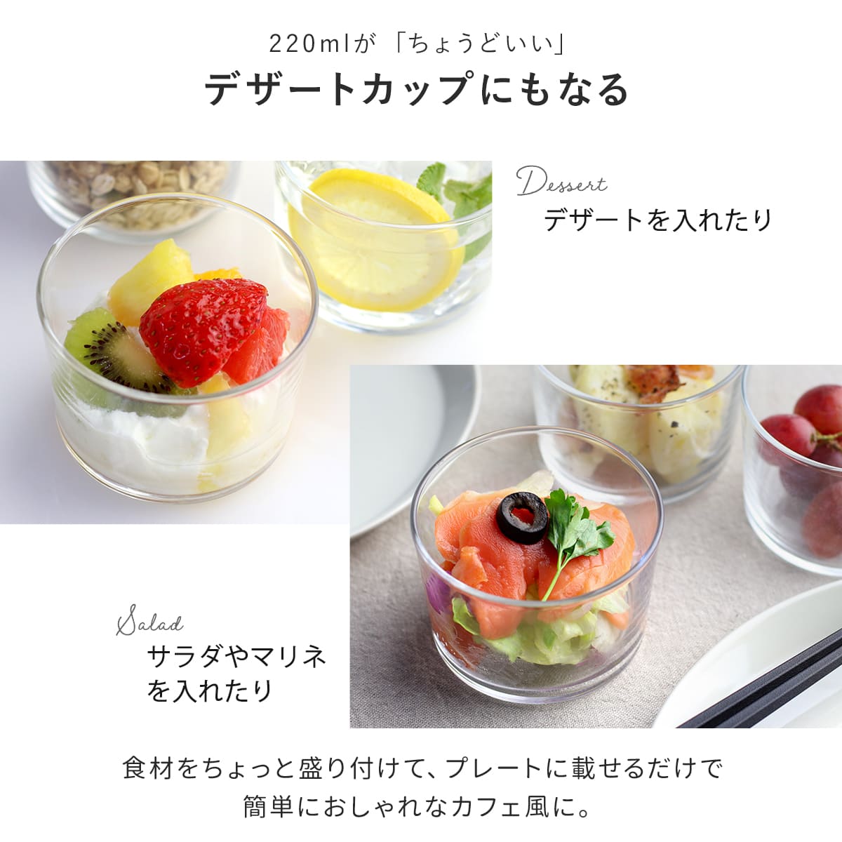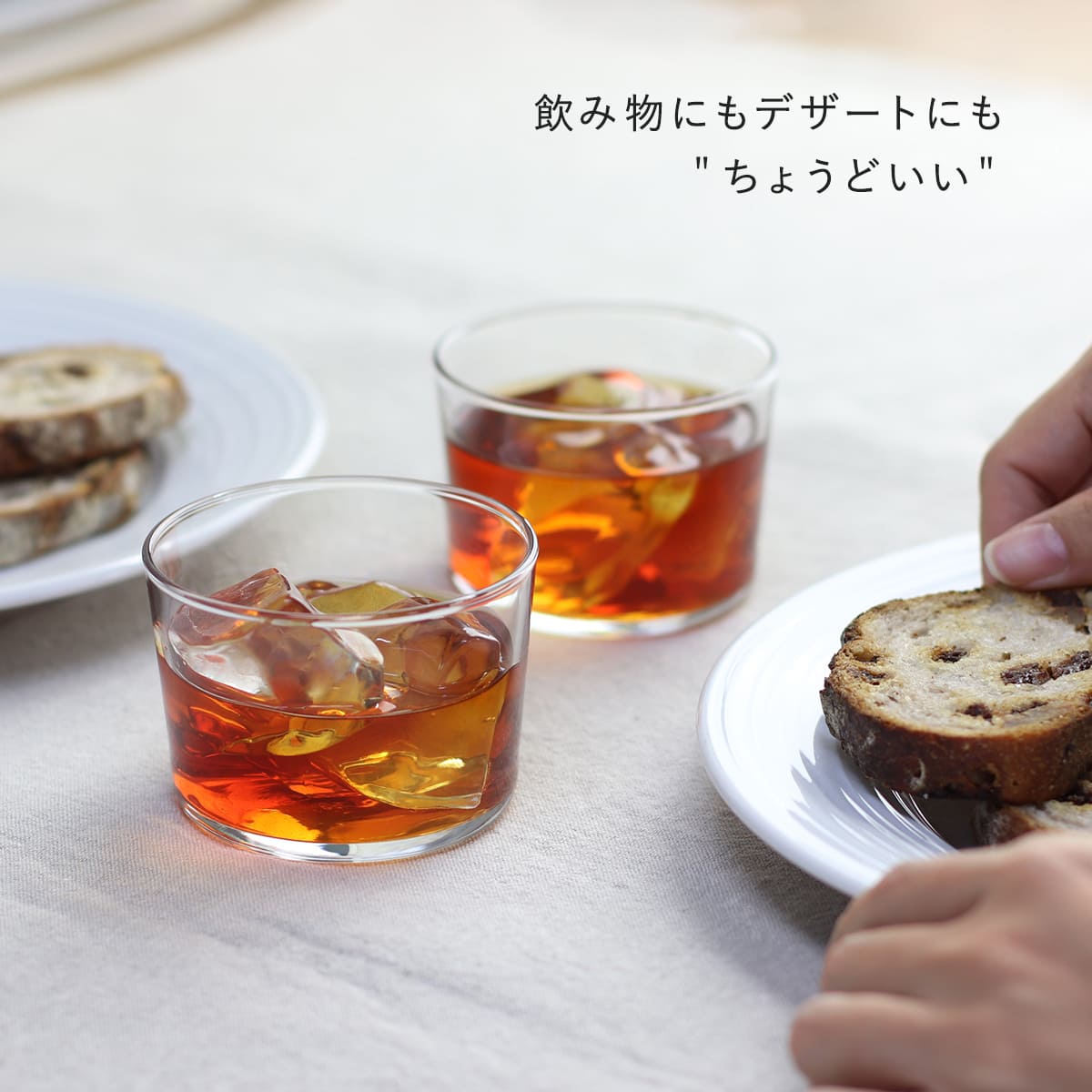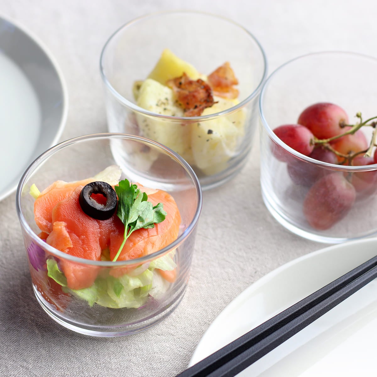 ちょっとした水分補給用のグラスとしてだけでなく、デザートカップにもちょうどいいサイズです。サラダやマリネ、フルーツやヨーグルトなどの食材をちょっと盛り付けて、プレートに載せるだけで簡単におしゃれなカフェ風に。