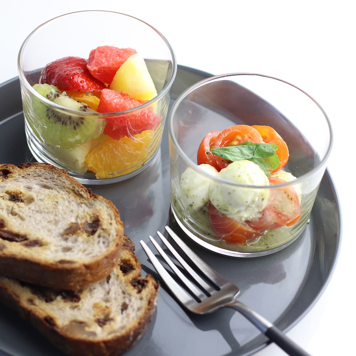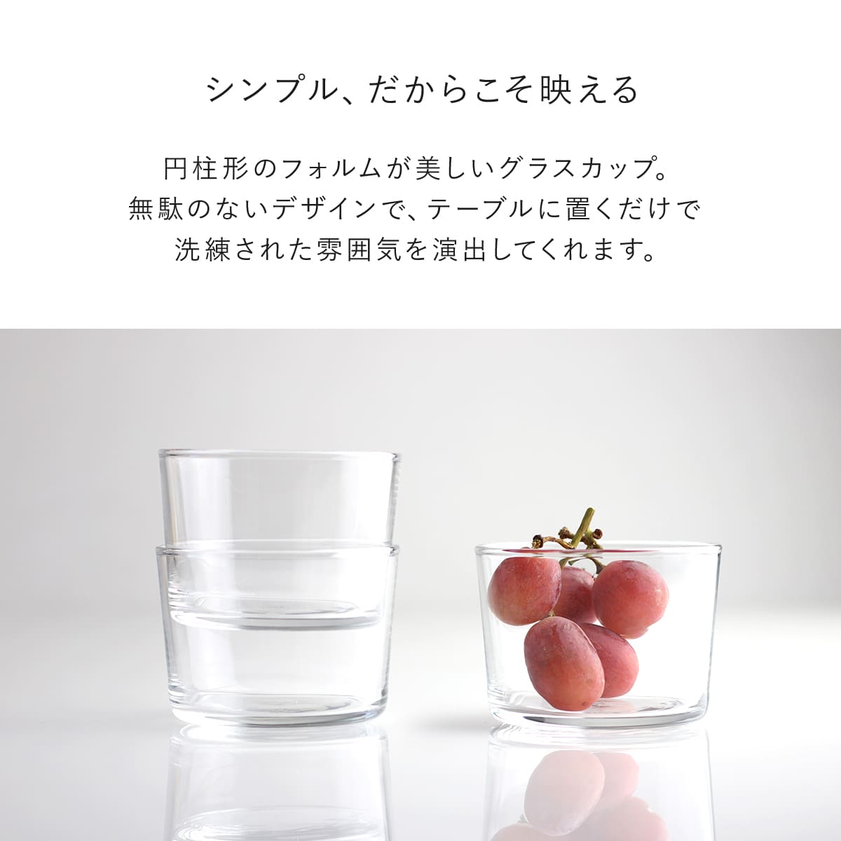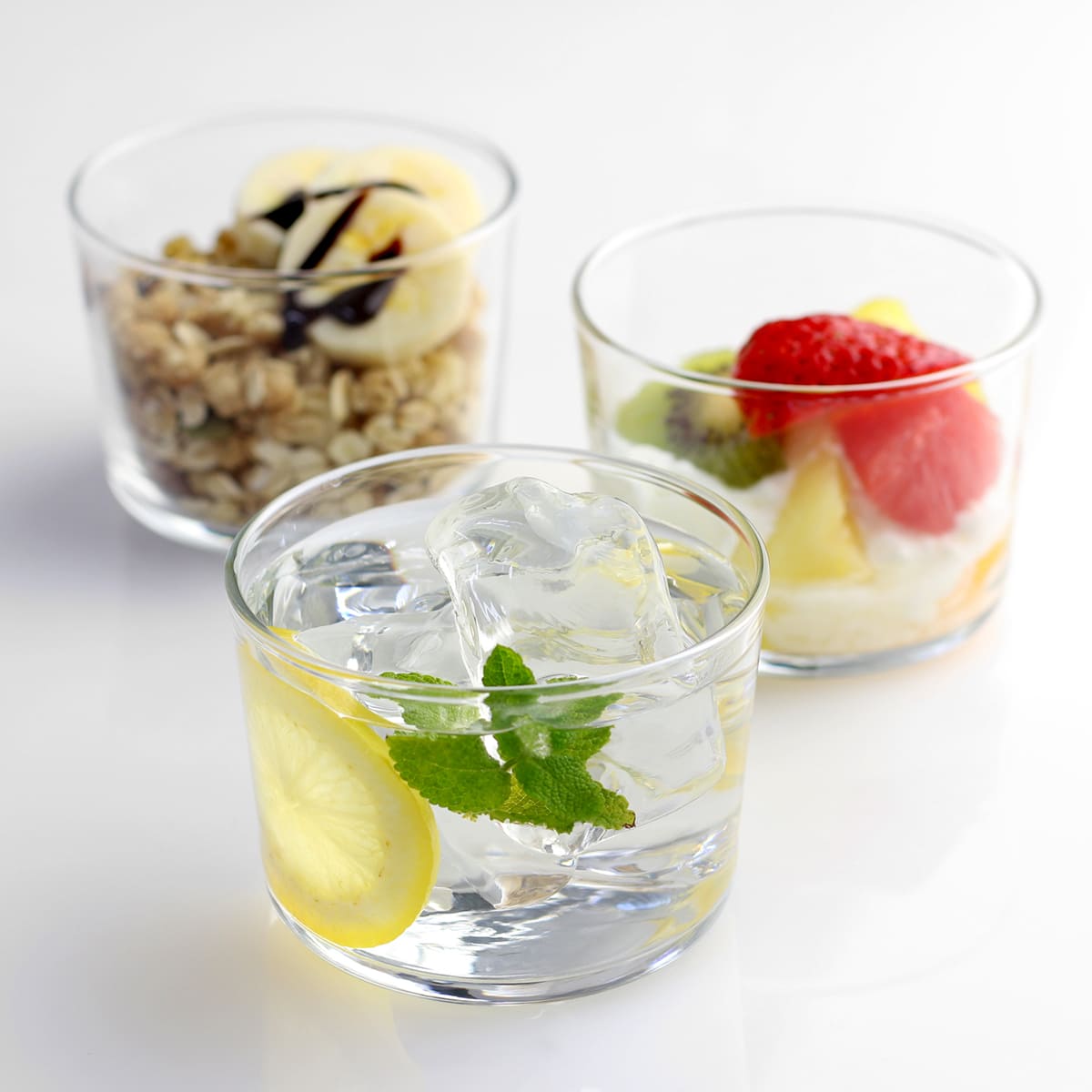 ちょっとした水分補給用のグラスとしてだけでなく、デザートカップにもちょうどいいサイズです。サラダやマリネ、フルーツやヨーグルトなどの食材をちょっと盛り付けて、プレートに載せるだけで簡単におしゃれなカフェ風に。