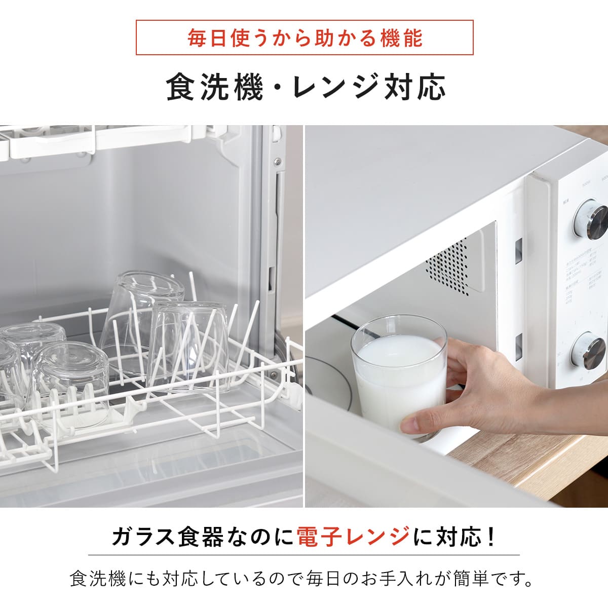 ガラス食器ですが、電子レンジに対応しています。食洗機にも対応しているので毎日のお手入れが簡単で、隅々までキレイに洗えます。