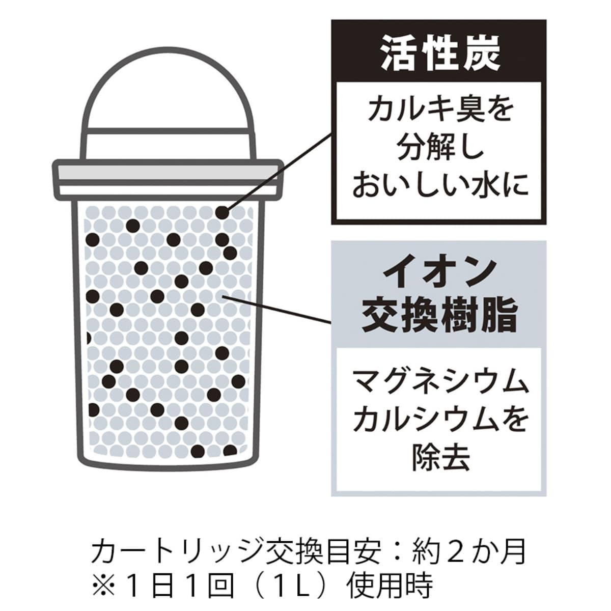 浄軟水ポットpureの交換用カートリッジです。カートリッジの活性炭がカルキ臭を分解し、イオン交換樹脂がマグネシウム・カルシウムを除去します。カートリッジの交換目安は、約2か月(1日1回1L使用時)です。