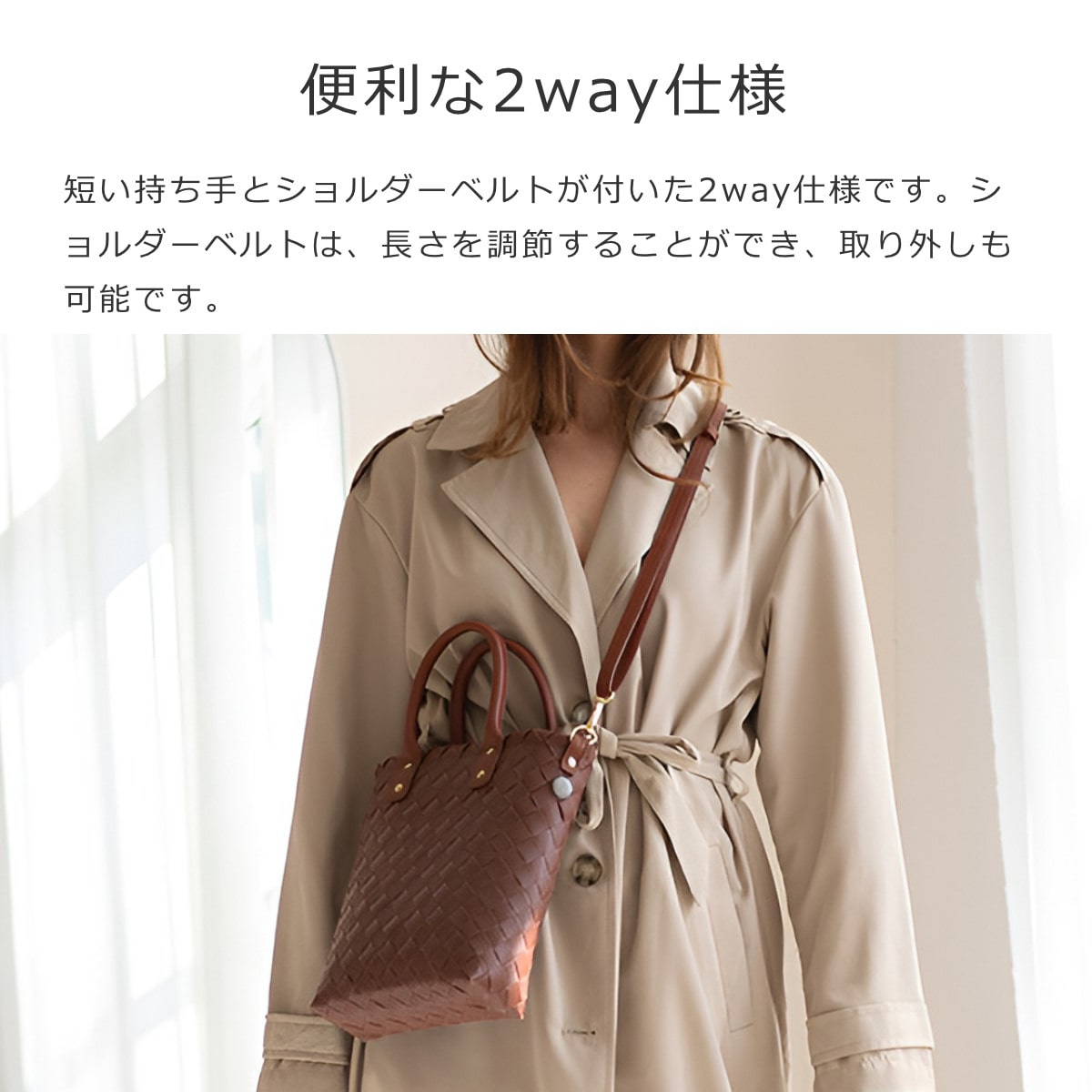 短い持ち手とショルダーベルトが付いた2way仕様です。ショルダーベルトは、長さを調節することができ、取り外しも可能です。
