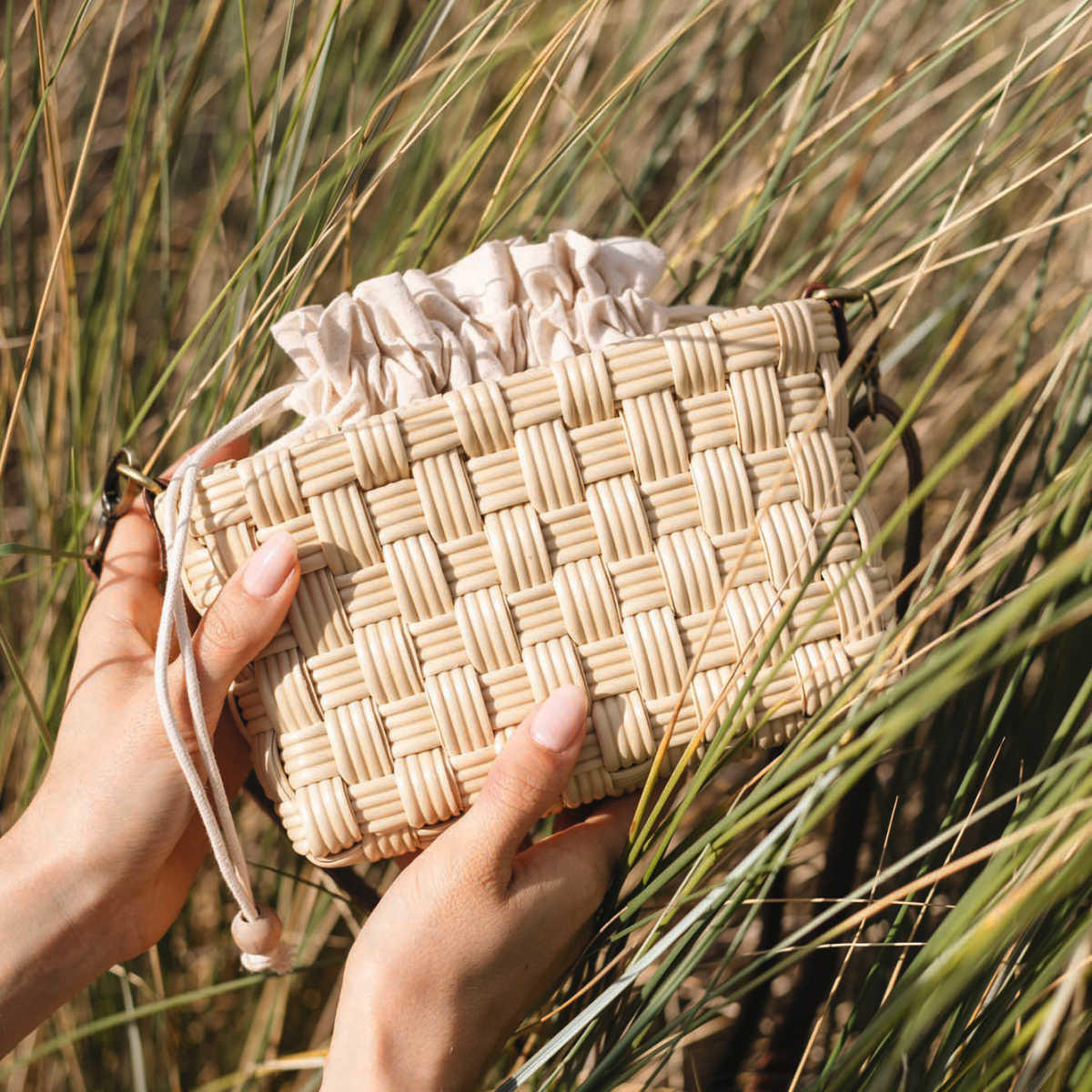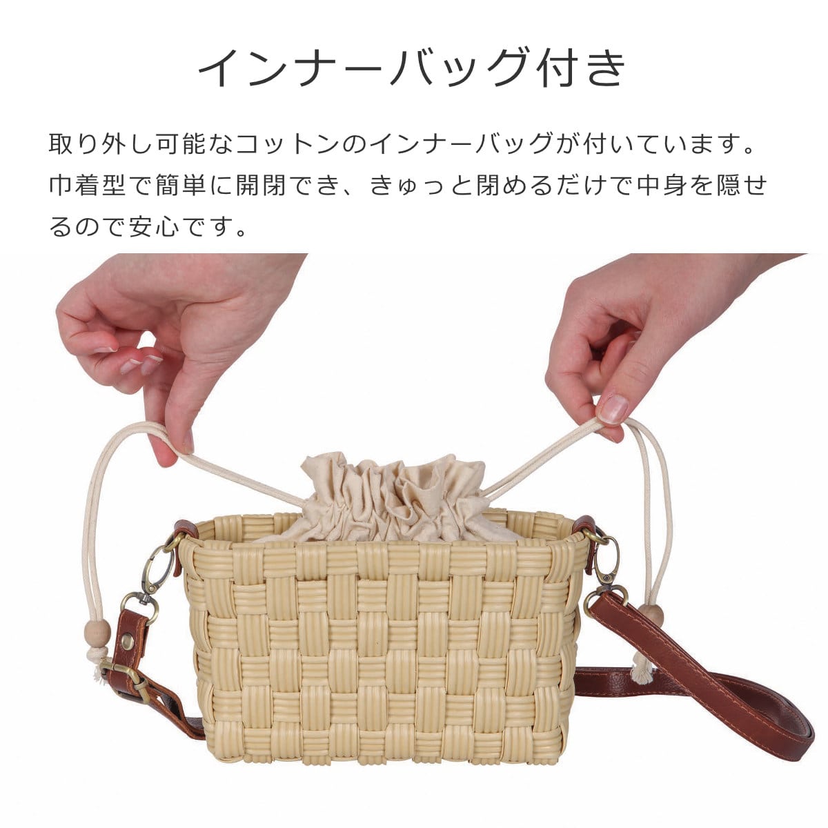 取り外し可能なコットンのインナーバッグが付いています。巾着型で簡単に開閉でき、きゅっと閉めるだけで中身を隠せるので安心です。