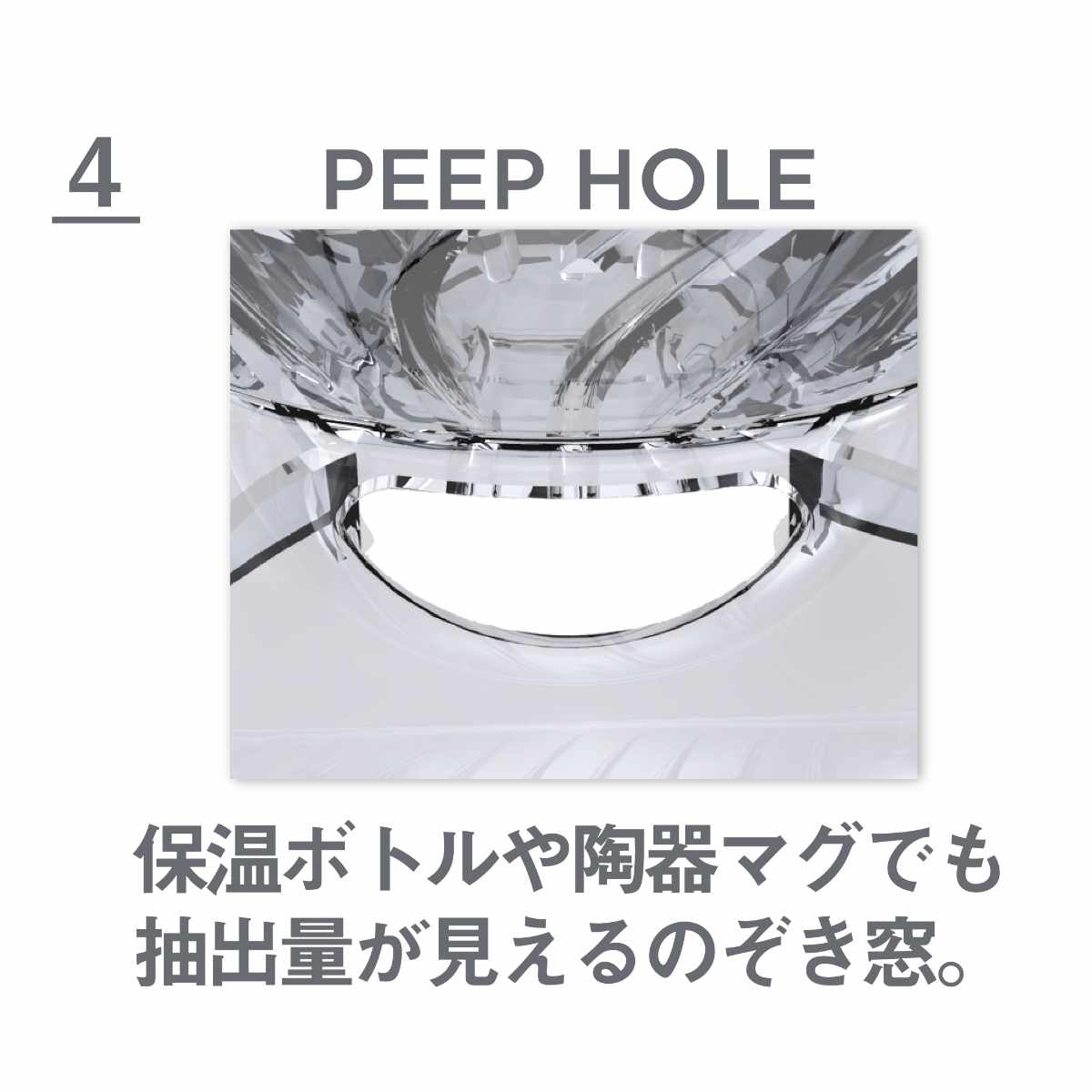 携帯用ボトルやマグカップにのせてドリップしても、抽出量が分かるようにのぞき穴が付いています。
