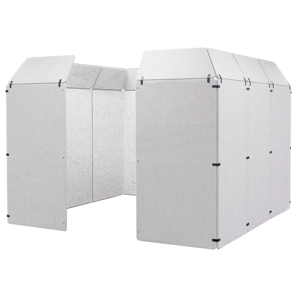 複数人での打ち合わせができるミーティング用吸音パーティションです。吸音効果の高いミーティングスペースを、簡単に組み立てて設置することができます。天面と出入口が開いたタイプなので、閉塞感なく、快適にお使いいただけます。