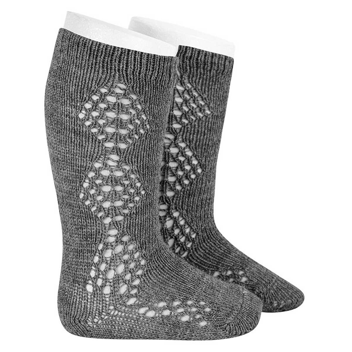 サイドに透かし編み模様が入ったハイソックスです。メリノウールブレンドで暖かく、お子さまの敏感な肌にも刺激が少ない、なめらかな肌ざわりです。どんなコーディネートにも合わせやすく、足元を可愛く演出してくれます。