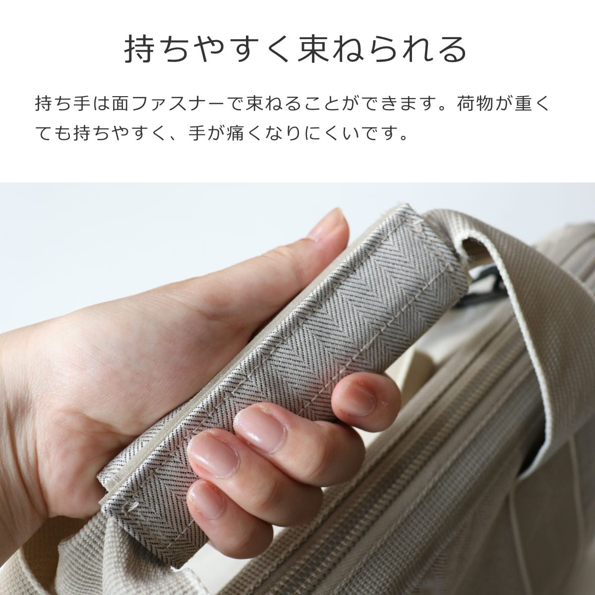持ち手は面ファスナーで束ねることができます。荷物が重くても持ちやすく、手が痛くなりにくいです。