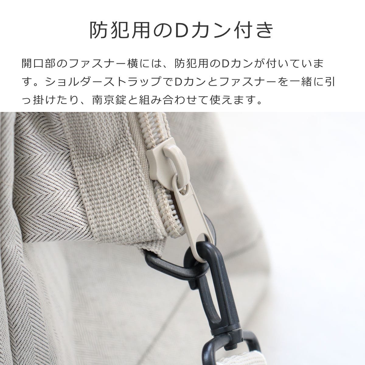 開口部のファスナー横には、防犯用のDカンが付いています。ショルダーストラップでDカンとファスナーを一緒に引っ掛けたり、南京錠と組み合わせて使えます。旅行時にも大切な荷物をしっかりと守ることができます。