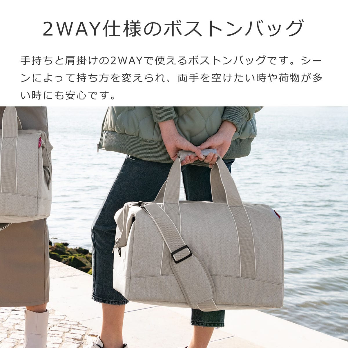 手持ちと肩掛けの2WAYで使える丈夫なボストンバッグです。シーンによって持ち方を変えられ、両手を開けたい時や荷物が多い時にも安心です。