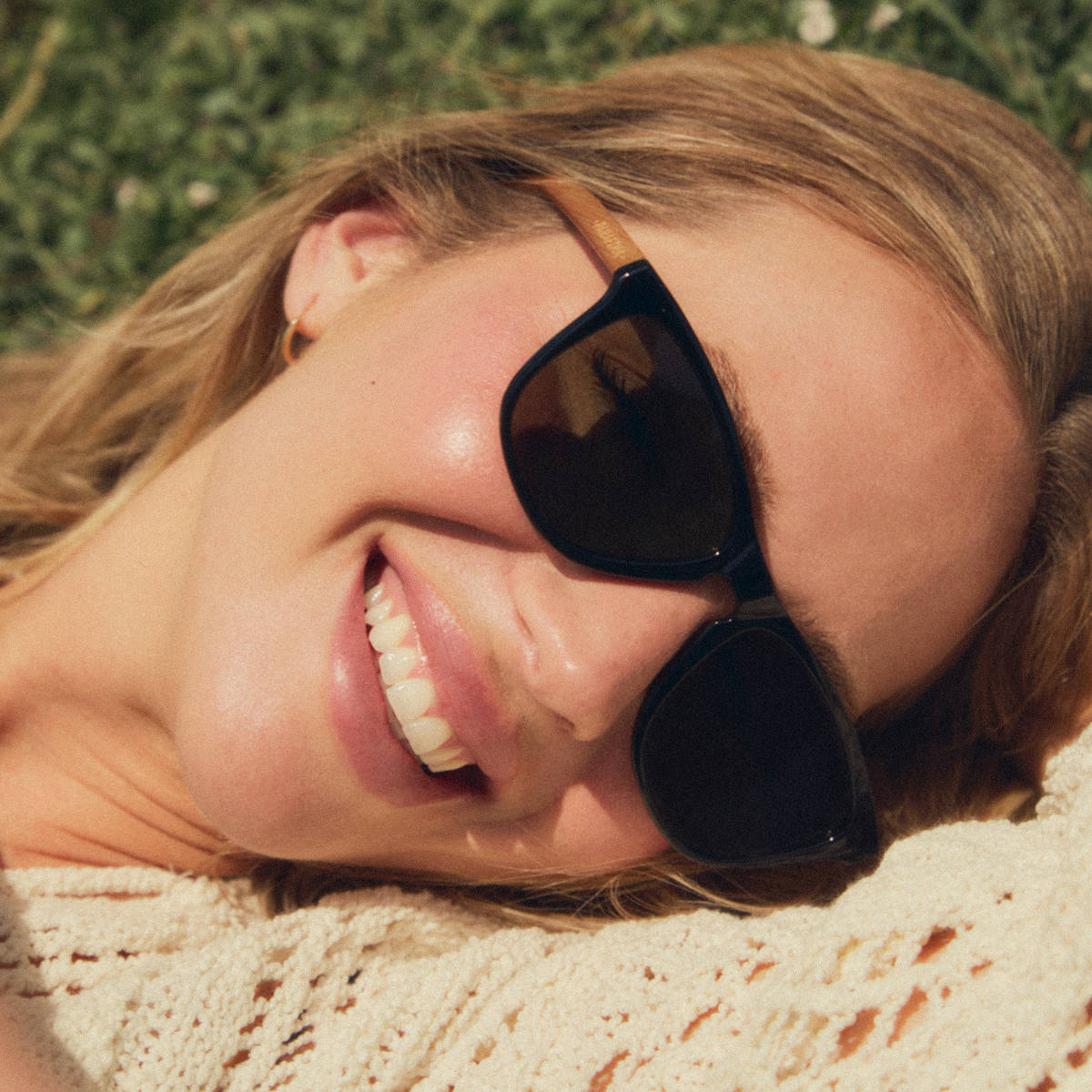 フレームは、洗剤やシャンプーボトルをリサイクルしたHDPE(高密度ポリエチレン) プラスチック、テンプルには有機竹を使用した環境に優しいユニセックスのサングラスです。
