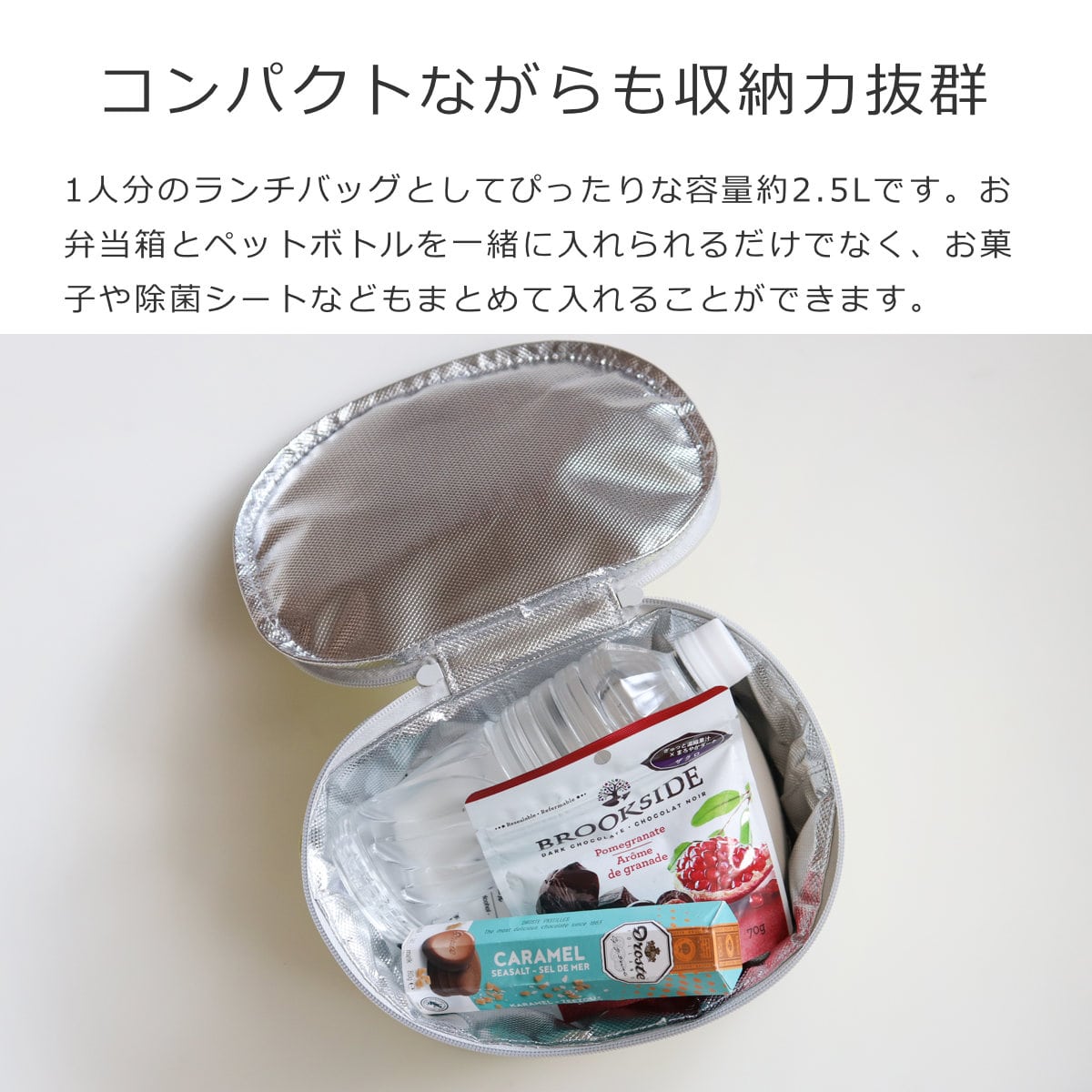 1人分のランチバッグとしてぴったりな容量約2.5Lです。お弁当箱とペットボトルを一緒に入れられるだけでなく、お菓子や除菌シートなどランチタイムに必要な荷物をまとめて入れることができます。コンパクトながらもしっかりと奥行があるので、収納力抜群です。
