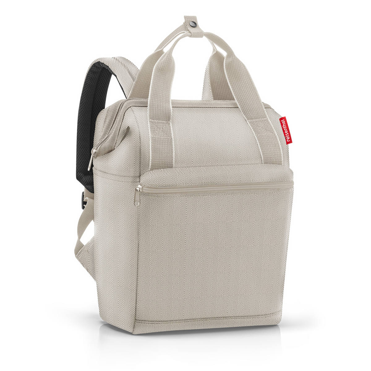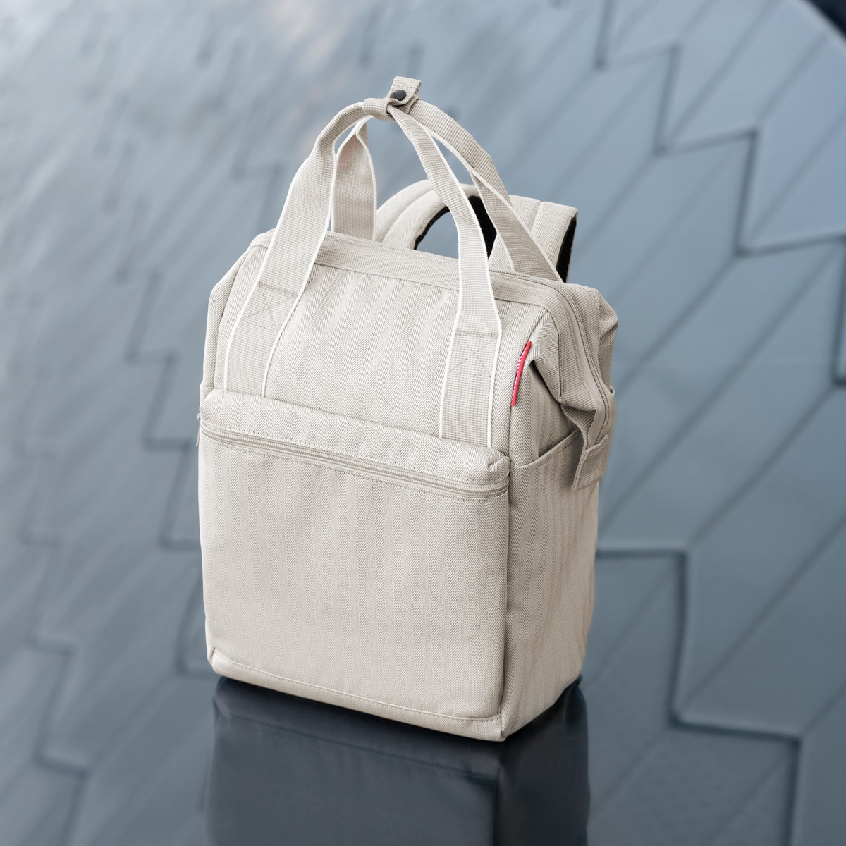 両サイドにはペットボトルや折り畳み傘などが入るポケット、前面にはファスナーポケットが付いています。キャリーハンドルをボタンで留めれば、すっきりとした見た目になります。