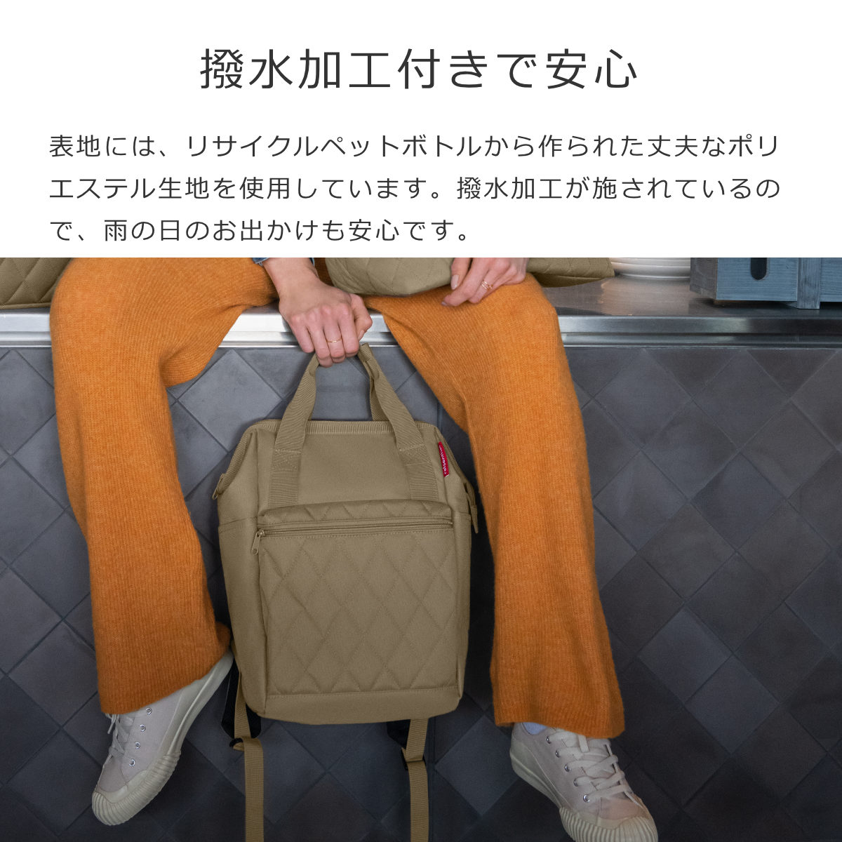 表地には、リサイクルペットボトルから作られた丈夫なポリエステル生地を使用しています。撥水加工が施されているので、雨の日のお出かけも安心です。