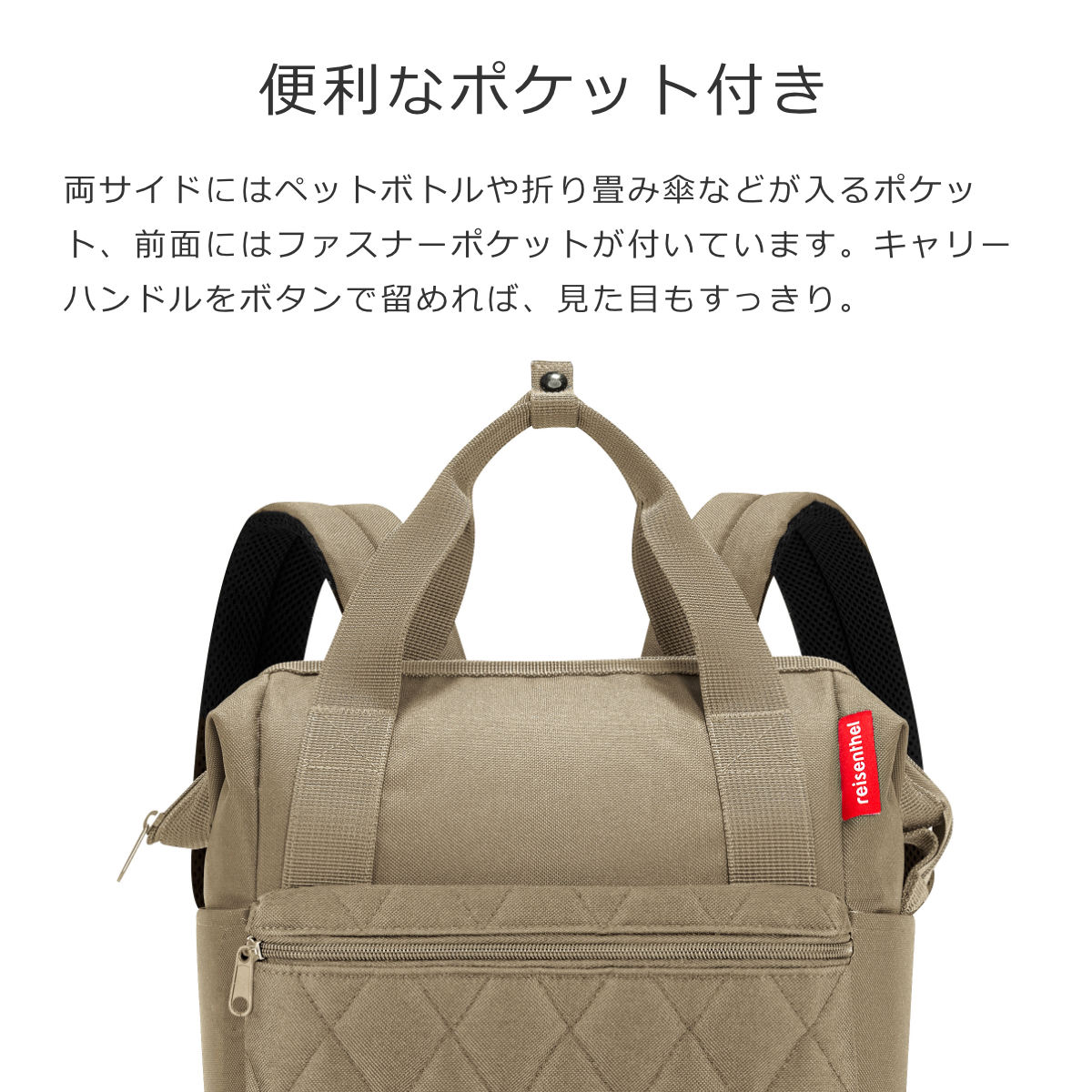 両サイドにはペットボトルや折り畳み傘などが入るポケット、前面にはファスナーポケットが付いています。キャリーハンドルをボタンで留めれば、スッキリとした見た目になります。