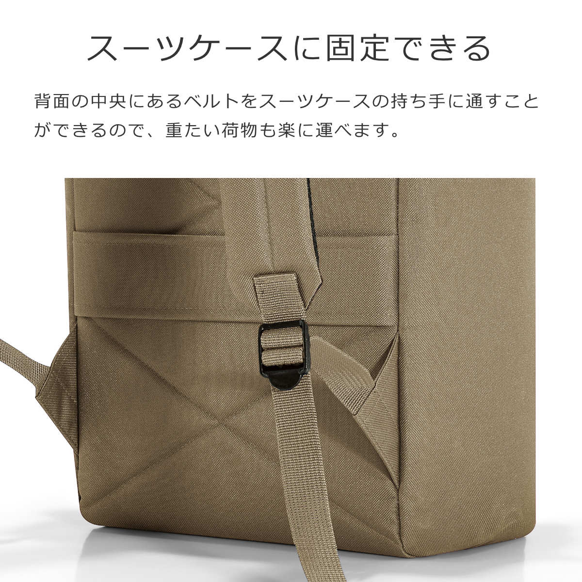 背面の中央にあるベルトをスーツケースの持ち手に通すことができるので、重たい荷物もラクに運べます。