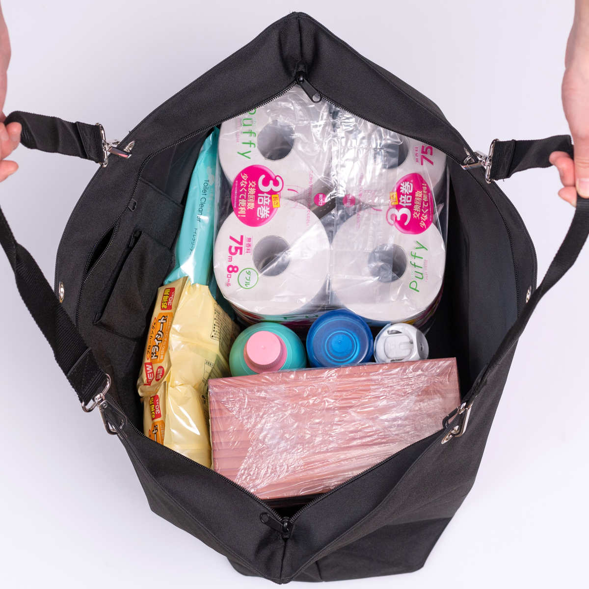 ショッピングバッグとしても優秀で、かさ張るボックスティッシュとトイレットペーパーなども入れられます。週末のまとめ買いにも活躍します。