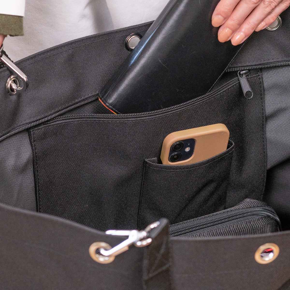 内側にはオープンポケットとファスナーポケットが各1つあります。さっと取り出せるオープンポケットは、携帯電話の収納にぴったりです。ファスナーポケットには、財布や鍵などの貴重品を入れると安心です。