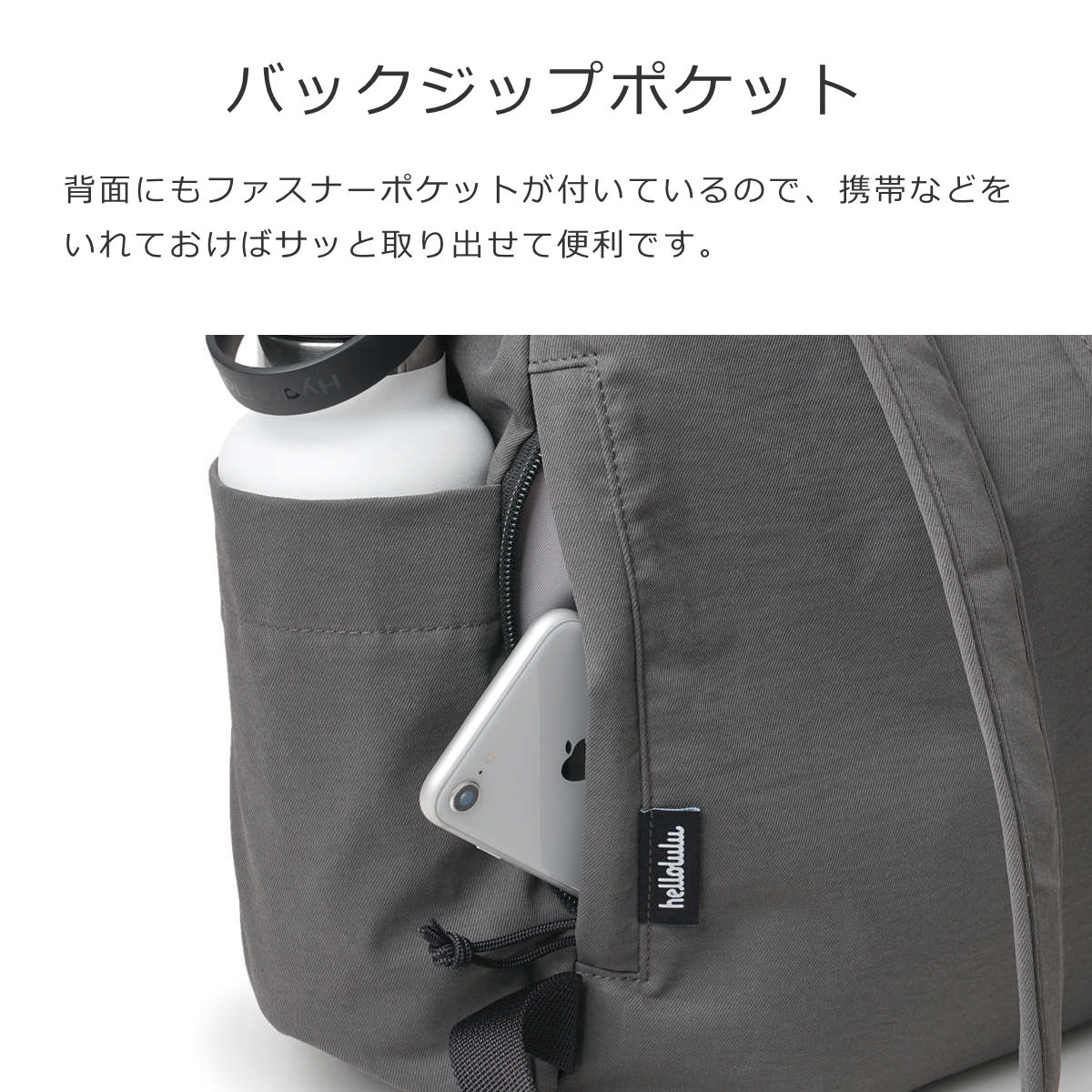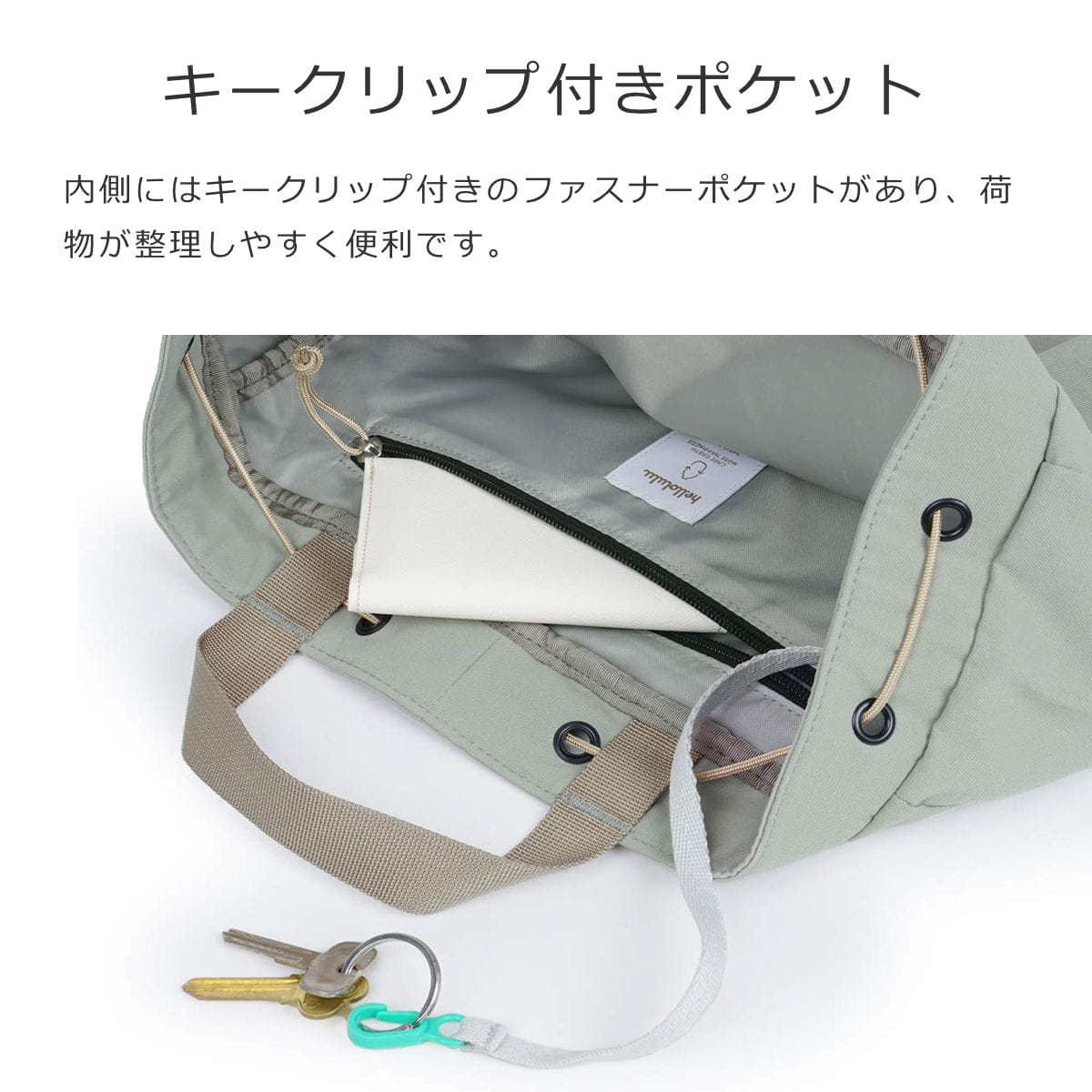 開口部は簡単に開閉できるドローストリングを使用しています。内側にはキークリップ付きのファスナーポケットがあり、荷物が整理しやすく便利です。